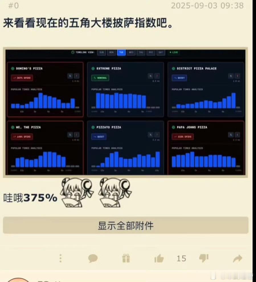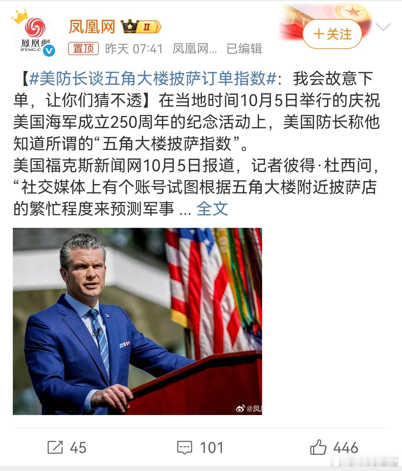 美防长谈五角大楼披萨订单指数厉害厉害,为了防止别人猜测五角大楼动态,美国防长表示会故意下单,让你猜不透。这大概就是三十六计中的瞒天过海吧,这计谋太厉害了[笑cry]