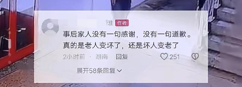 “心寒了!”近日,湖南常德,男子看到一推车老人摔倒,出于好心帮老人扶车,结果没有得到一句感谢的话,还被老人家属冤枉成肇事者,不仅索赔3万元,还要追究男子的肇事逃逸责任。男子为此精神恍惚,折腾了十几天,终于找到一个隐蔽角落的监控,证明了自己的清白。不料,老人家属看完监控后,只说了一句“对不起”就走了,还声称证据不足,不愿再追究男子的相关责任。 “一句对不起就完了?”尹先生(化名)怎么都没想到自己一次做好事最后落得这样的下场...... 9月14日那天,尹先生像往常一样准备开始工作,但早上却发现儿子小涛神情有些不对。 通常,小涛活泼开朗,早上总是第一个从床上跳起来,和他打闹一番,然后一起吃早餐。 但今天,儿子却显得非常安静,坐在沙发上,双手抱着膝盖,眼神有些呆滞,尹先生赶紧带着孩子去医院。 那天,尹先生骑着电动车去医院的路上。正当他穿过一栋楼正上楼梯的时候,突然听见身后传来一阵急促的摔倒声。 他赶紧停下车,回头看去,发现一位老人摔倒了,尹先生第一反应就是赶紧去帮忙。 他立刻到老人身边,小心地扶起老人,并关切地问:“老人家,您怎么样?哪里不舒服吗?”老人的表情痛苦,似乎有些站不稳,尹先生赶紧把车扶好,扶着老人坐在了路边。 事后事情的发展却出乎尹先生的预料。 不到半小时,老人的家属便赶到了现场。 他们得知事情经过后,突然转变态度,一口咬定尹先生就是肇事者,甚至扬言要让尹先生赔偿三万元医药费,并威胁要追究“肇事逃逸”的责任。 尹先生简直无法理解,他试图解释自己根本没有碰到老人,只是好心扶起他并带他去医院,可老人家属根本不听他的解释,眼看局势愈发紧张,尹先生感到非常无奈和焦虑。 接下来的十多天,尹先生的生活被彻底打乱了。除了要照顾儿子生病的情况,他还要应对这突如其来的冤屈。他觉得自己每天都在焦虑中度过,吃不下饭,睡不着觉。 压力堆积在他的心头,他觉得自己陷入了一个无底的深渊,似乎怎么努力也无法摆脱这个不公的指控。 为了洗清自己的冤屈,尹先生决定自己寻找证据。他不断回到事发地点,挨家挨户地询问,试图找到能够证明自己清白的目击者或者监控视频。 就在他快要放弃时,在一个隐蔽的角落里,尹先生终于找到了能够拍摄到事发经过的监控视频。 视频清晰地显示了那天的真实情况:尹先生并没有与老人发生任何碰撞,二人只是擦肩而过。 视频更重要的细节是,尹先生在听到老人摔倒的声音后,才毫不犹豫地转身回去帮助老人。 尹先生那时已经走进了一栋楼,正在上楼梯,听到声音后才迅速下楼。他的动作清晰地记录在视频中,证明了他是在老人摔倒后才出现在现场,并且出于真诚的好意去扶起老人。 拿到这段视频后,尹先生如释重负地将它交给了老人的家属。 面对这一切真相,之前还咄咄逼人的家属瞬间沉默了。 他们没有继续争辩,而是只留下了一个轻飘飘的“对不起”,然后转身离开了。尹先生心里虽然松了口气,但也感到愤怒和不解。 他忍不住想,这样一个简单的道歉,怎么能弥补他十多天的痛苦和煎熬?那些无端的指责、威胁和压力,最终竟然只换来了这么一个轻描淡写的“对不起”,让他觉得所有的坚持和努力都显得如此微不足道。 尹先生的遭遇敲响了警钟。要让好人敢于出手,光有“好人法”这个盾牌是不够的。 我们更需要一把利剑,建立起有效的反向追责机制,让信口雌黄的诬告者付出应有的代价。 只有让天平回归平衡,让善意不再背负如此沉重的枷锁,当再有人需要帮助时,我们才敢毫不犹豫地伸出援手。