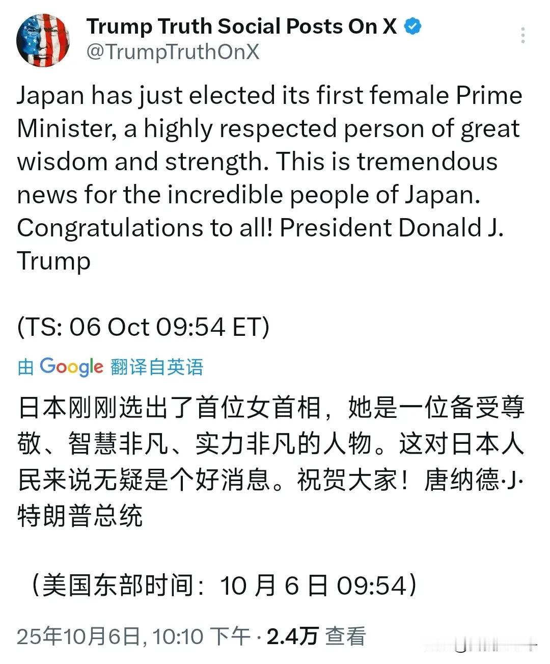 日本这次选出的女首相看来很合特朗普的心意!特朗普在社交媒体上高度赞扬了高市早苗! 特朗普表示这是一位备受尊敬,智慧非凡,实力非凡的人物! 这对于日本人民来说无疑是一个好消息,祝贺大家! 这就不用评论了吧,美国终于如愿以偿了,选了一个非常听话的代言人! 下一步咱们就看看吧,这位高市早苗,会不会把日本变成亚洲版的乌克兰! 反正美国人肯定是愿意看到这一幕的!