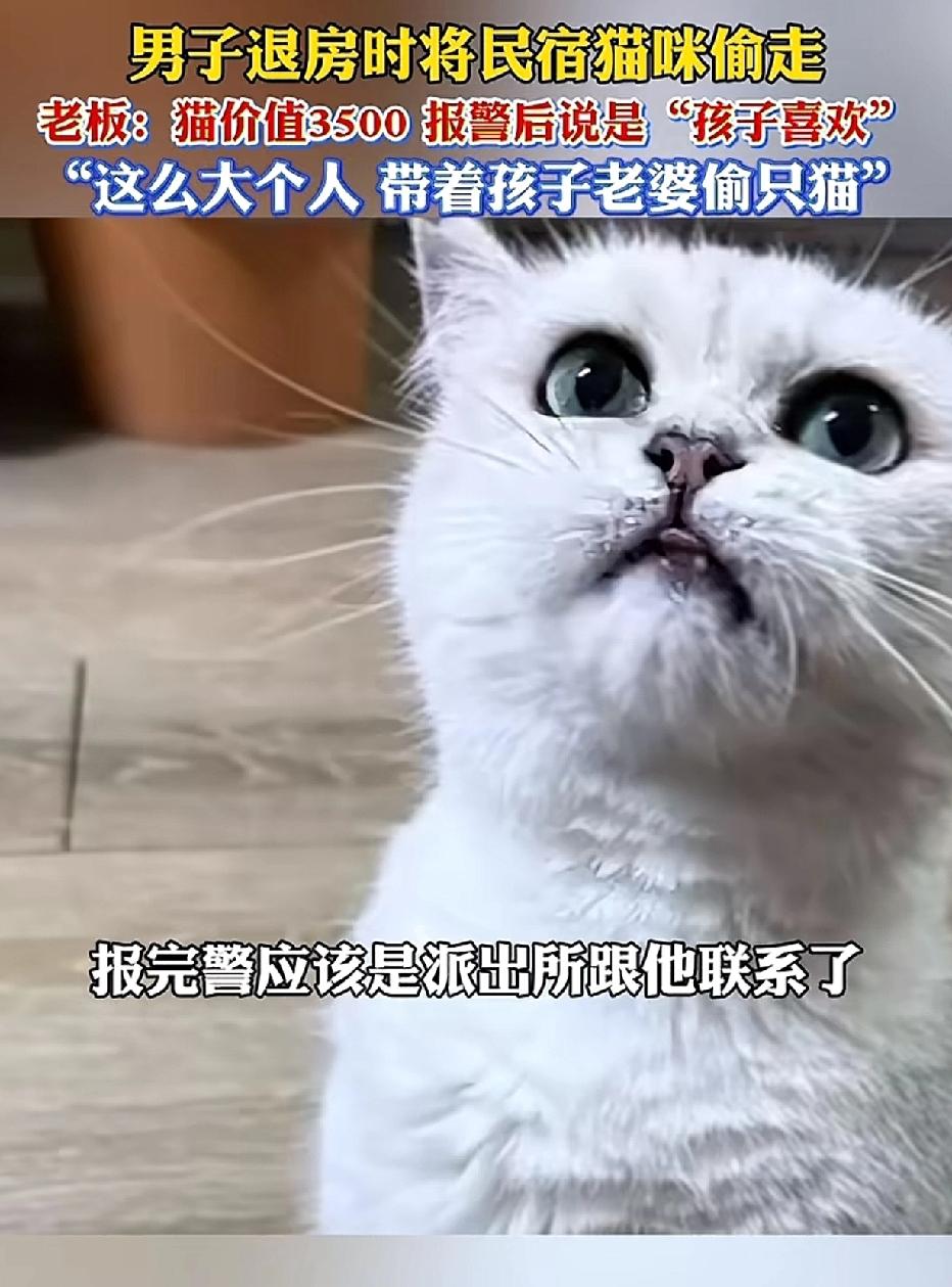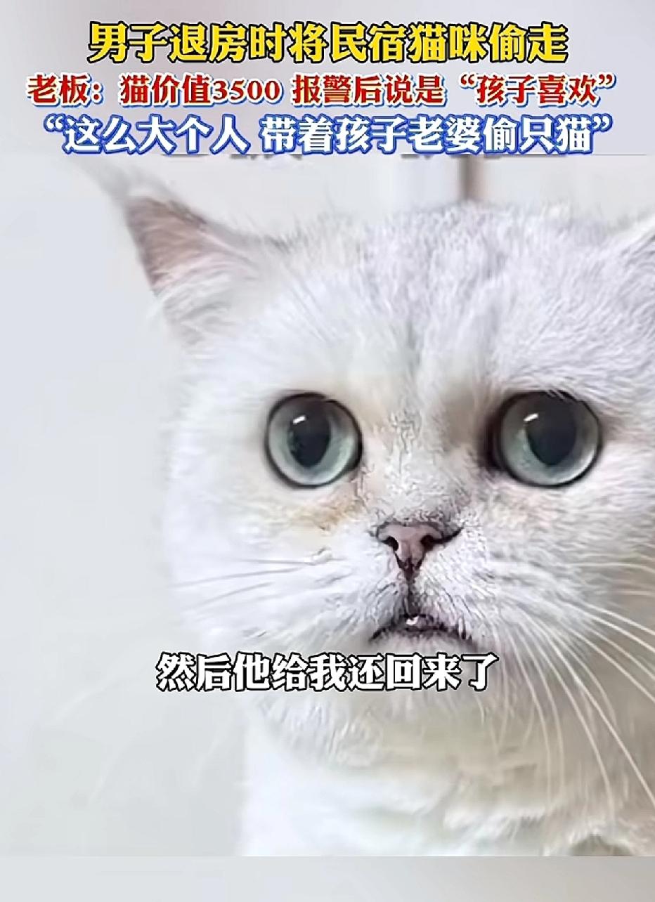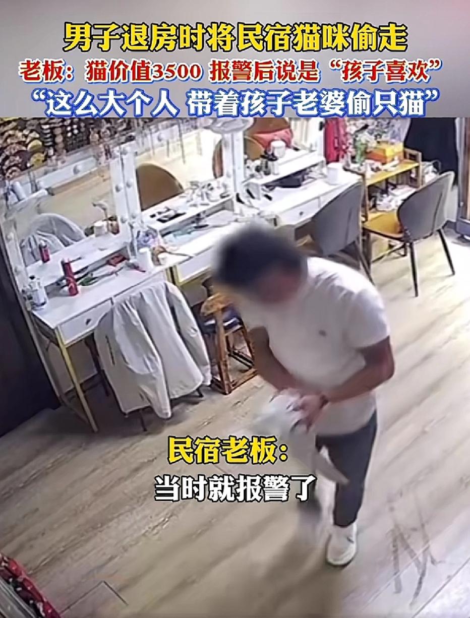 一家人前往河南洛阳旅游,男子在民宿中见到一只银渐层猫,喜爱至极,便轻轻将猫抱进了房间。 随后,一家人迅速办理退房离开了。 两小时后,民宿老板发现猫不见了,便调取监控,才知道是男子把猫抱走了,这只猫价值3500元。 民宿老板首次给男子打电话,无人接听,再次拨打时已被拉黑。 民宿老板报了警,警察致电男子后,猫才被送回。 男子解释称,是孩子喜欢这只猫,所以才把猫装进了行李箱带走。男子诚恳地向民宿老板道歉,并获得了谅解。 孩子喜欢别人的东西,家长就能将其据为己有吗? “有其父,必有其子”并非是必然的宿命,而是在警醒家长:你的一举一动皆是孩子最直观的示范,你期望孩子成为怎样的人,自己首先要朝着那个方向努力。 来源:发现大连