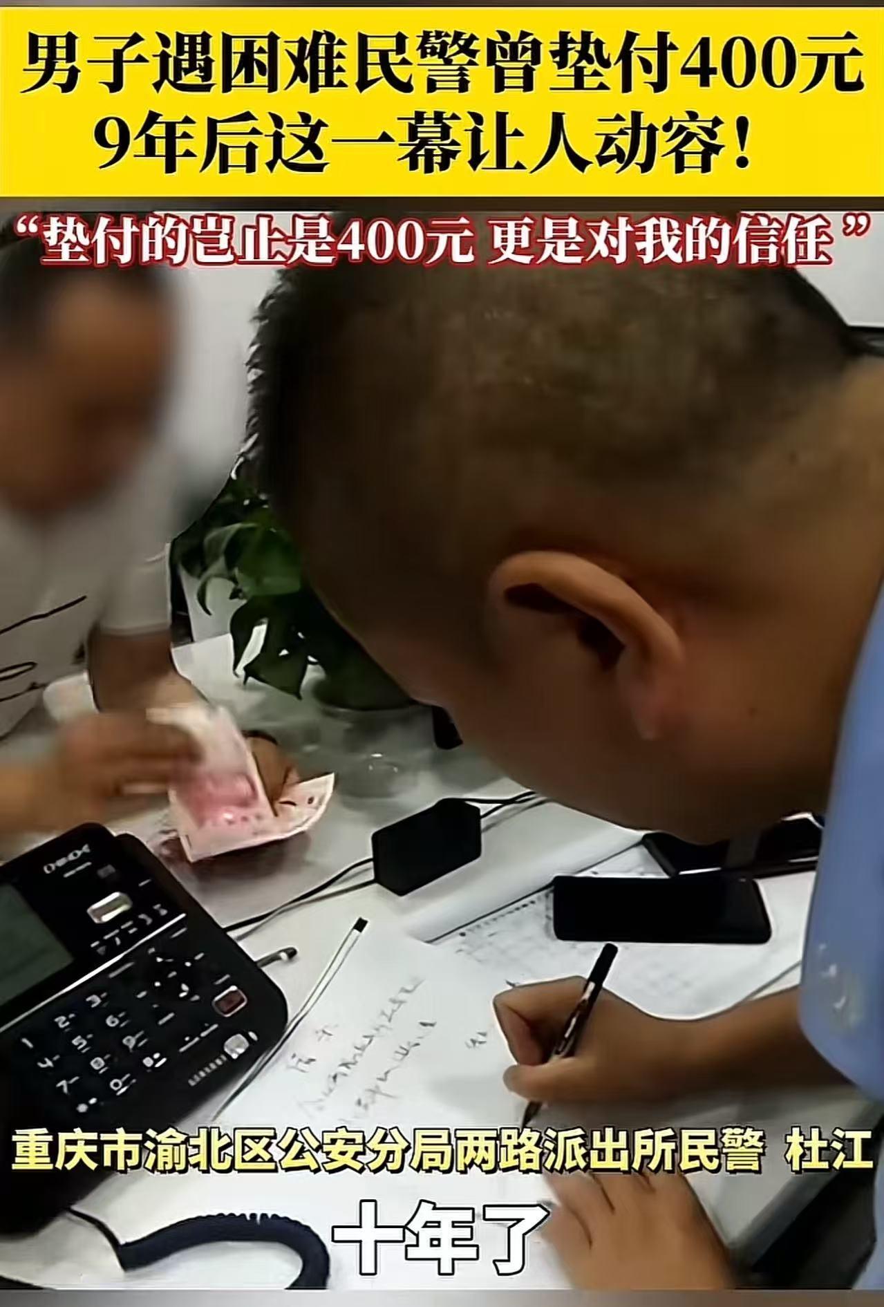 这一幕让人动容!7月的一天,重庆的一个派出所发生了一起温馨的事,9年前一男子遇困难民警帮垫付400元,男子保证还钱并写下欠条,可之后他却“食言”了,导致民警被同事嘲笑遇到骗子!但万万没想到,男子9年后却找上门,说要兑现借条! “迟到10年的欠款,看的真让人感动....” 九年前,程先生刚从老家来到重庆。 那时候的他背着一个鼓鼓囊囊的旧帆布包,坐了十几个小时的绿皮火车,一下车就被这座城市的灯火和车流震住了。 可震撼过后,更多的是茫然——他没有什么技能,也没有熟人,能做的就是到处找零工。 刚开始,他在建筑工地上搬砖、扛水泥,每天工作十几个小时,肩膀常常被磨破皮。 后来工地停工了,他又去当过搬运工、送货员、洗车工,哪里缺人就往哪里跑。 天气热的时候,衣服总是被汗水浸透;冬天又冷得钻进被窝都能打哆嗦。 有一阵子,他实在找不到活干,程先生陷入了极度无助的境地:那段时间手头拮据,连最基本的生活费都凑不齐。 他正为晚饭发愁的时候,重庆的一名民警杜家出现在了他的面前。 杜警官看到程先生的窘境,二话不说,先帮他垫付了400元,让他能够暂时渡过难关。 程先生当时感激得几乎说不出话来,只能连忙写下一张欠条,郑重承诺:“这笔钱,我一定会尽快还上。”他心里暗暗告诉自己,一旦回到老家,一定要通过自己的努力,把这份恩情回报上。 回到家后,程先生每天早出晚归,做零工、打临工,生活虽然依旧艰难,但心里总有一股力量在支撑他——那是对杜警官信任和帮助的感激。 这些年来,程先生一直把这件事挂在心头。 每当自己攒下一点钱,他就想着赶紧还上这笔债,可问题是,他没有杜警官的联系方式,也没有办法轻易回重庆。 再加上那几年家里经济状况一直不好,生活压力巨大,所以他一直没能兑现当初的承诺。 程先生这次特意从老家赶到重庆,直奔两路派出所,就是想寻回当年在他最困难时伸出援手的杜警官。 一路上,他心里既紧张又激动,脑海中不断回想起九年前那段最窘迫的日子——手头拮据、连一顿热饭都难以凑齐,而那个陌生人的善意却让他重新看到了希望。 当程先生走进派出所,看见杜警官坐在办公桌前处理文件时,心头猛地一紧。他深吸一口气,快步走上前,眼眶微红,声音都有些哽咽:“杜警官,我……我来还您钱了!”同时,他伸手紧紧握住杜警官的手,仿佛要把这些年的感激一并传递过去。 杜警官一时愣住,看着眼前这个陌生面孔,半晌才没有认出程先生。程先生连忙补充道:“就是九年前,您帮我垫付的那400元!” 这下杜警官才恍然大悟,嘴角露出笑意,回忆起当年那个瘦弱、困顿的年轻人。他心里一阵温暖。其实,当初程先生写下欠条后一直没还钱,杜警官的同事们还开玩笑说:“你这钱是不是被人骗走了?” 可杜警官从没介意,他始终认为,程先生没能及时还钱,一定是遇到了真正的困难。这笔钱,不光是金钱,更是一种信任的传递,他愿意当作是对一个陌生人的帮助。 程先生深深低下头,声音带着些许哽咽:“杜警官,这张欠条,我欠了您近十年了,对不起……” 杜警官摇摇头,笑着感慨:“十年了,你还能记得这件事,真的不容易。” 程先生眼眶湿润,语气坚定而真诚:“可您那天帮的不只是400元,您垫付的是对我这个陌生人的信任,是托住了一个摇摇欲坠的家。” 杜警官听到这里,也沉默了片刻,心里充满了温暖。他没想到,当年的一件小小善举,在程先生心中竟留下了如此深刻的烙印。 信息来源:《男子到派出所兑现9年前的借条》温州交警