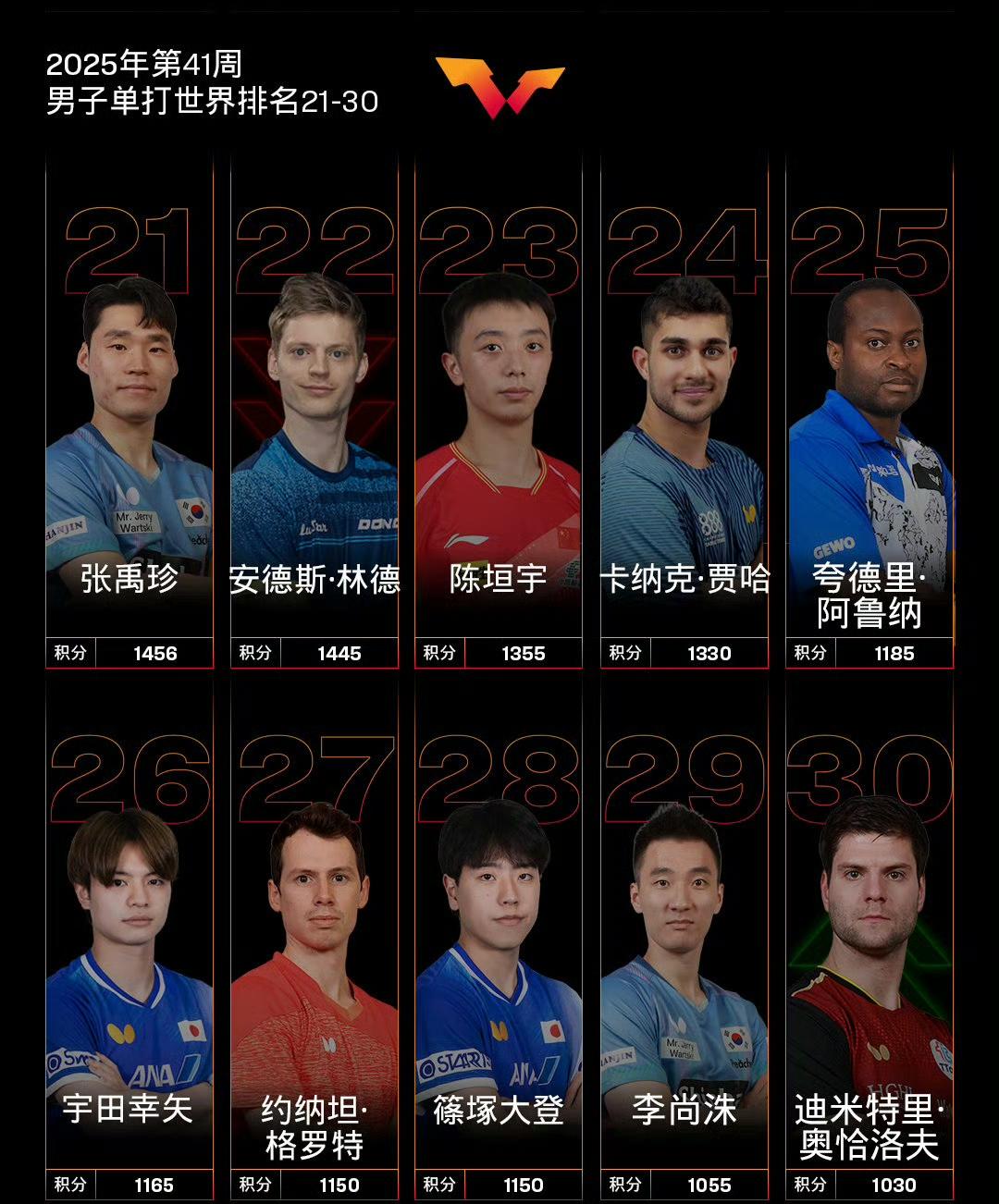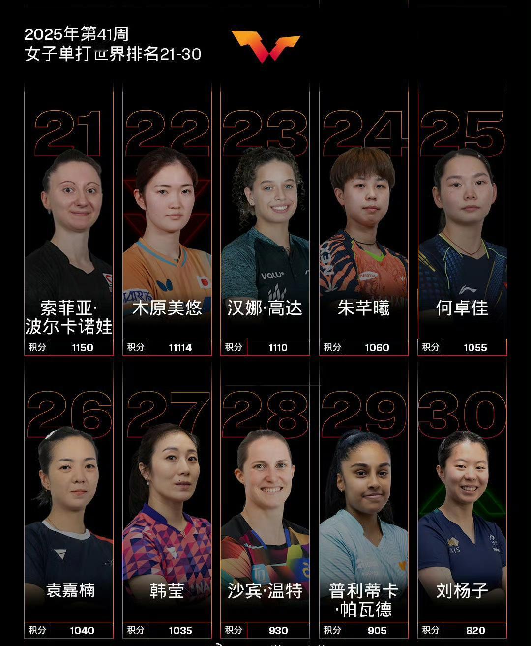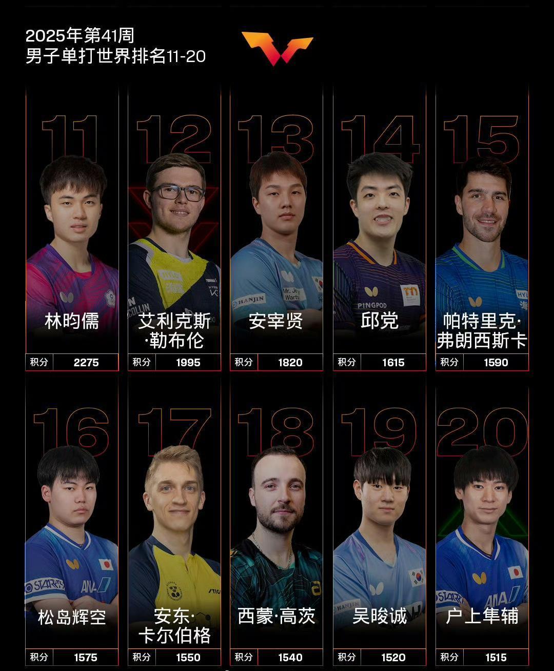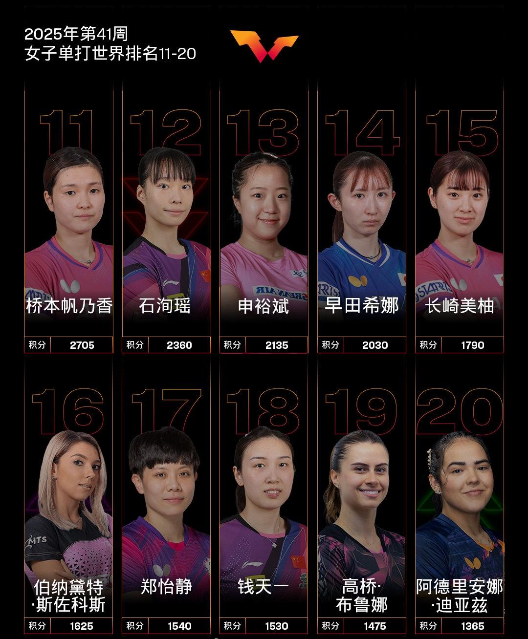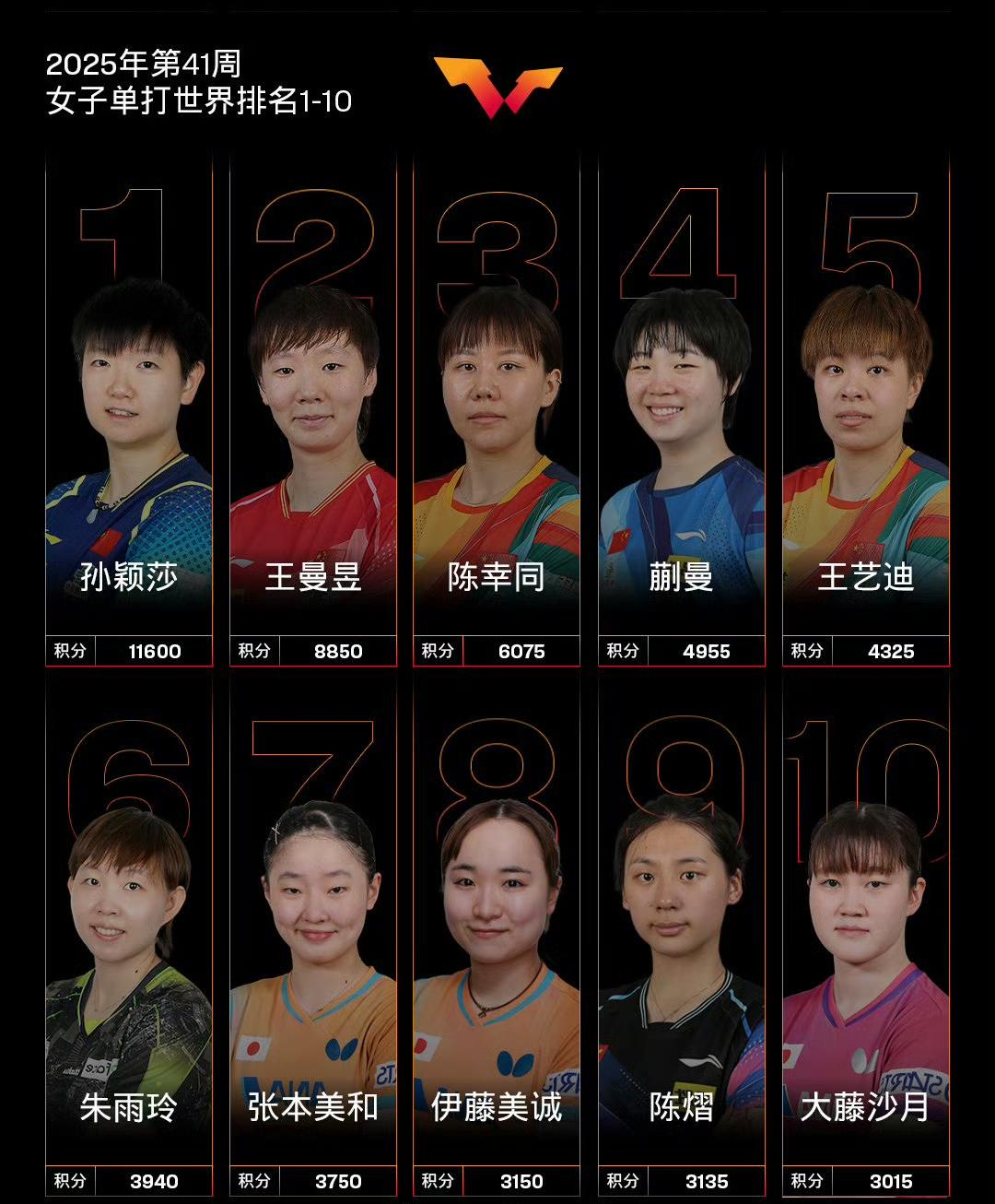 国际乒联最新世界排名! 国际乒联2025年第41周世界排名如图所示。 本周将加