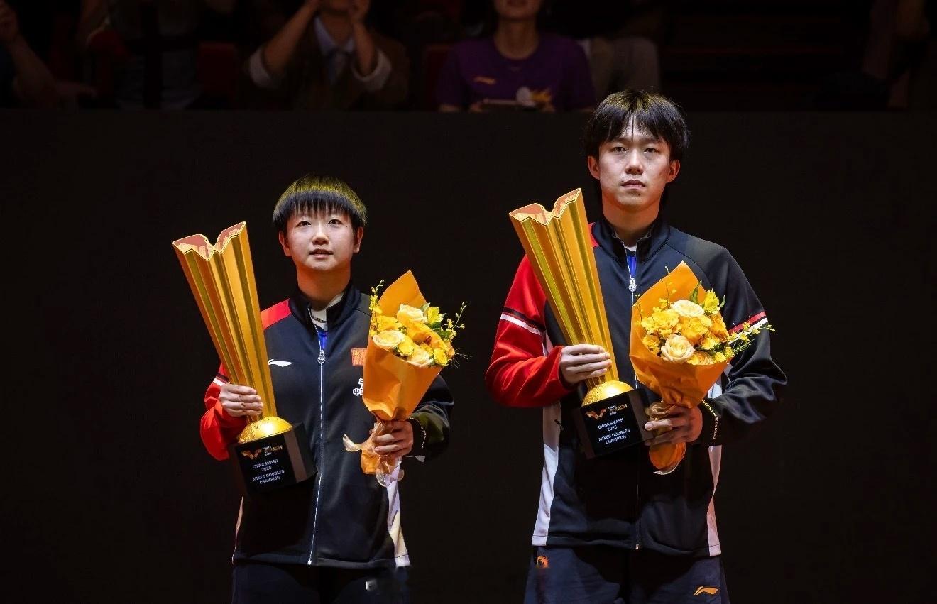 WTT中国大满贯混双决赛,王楚钦/孙颖莎3-0战胜黄友政/陈熠,夺得混双冠军,这也是王楚钦/孙颖莎在WTT大满贯混双收获的第五个冠军!