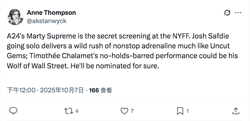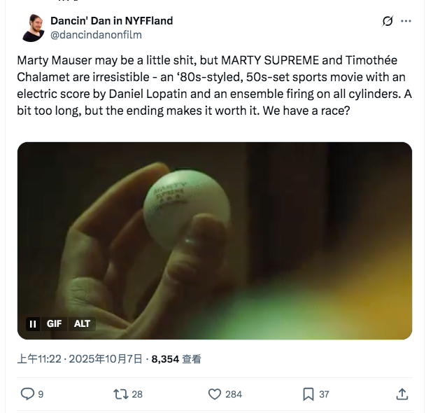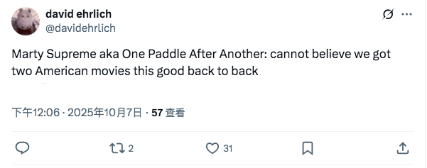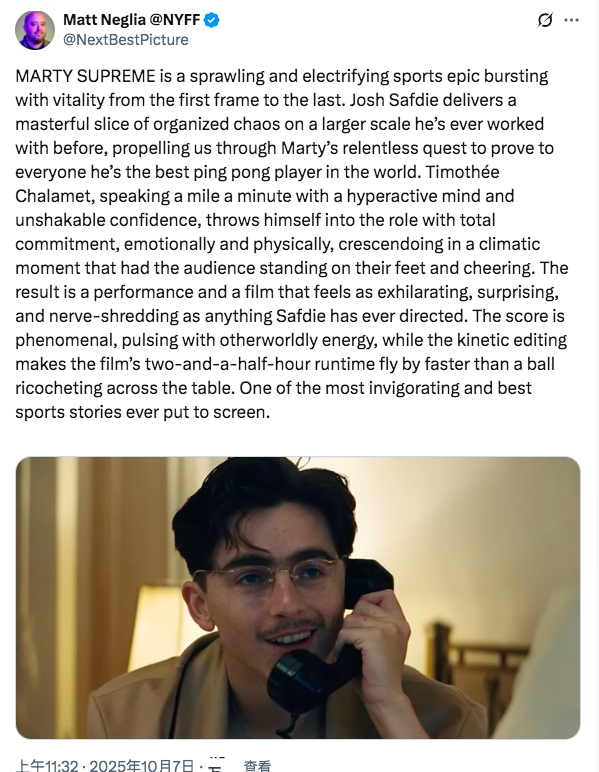 TNABO 《至尊马蒂》首轮反馈:约书亚·萨弗迪生涯最佳导演之作,提莫西·查拉梅生涯最佳表演之作,是许多人难以想象在刚看完《一战又一战》后又能收获的好东西,在紧张癫狂的两个半小时内走进乒乓神童的狂妄、焦躁,成为历来最精彩也是最具活力的体育电影之一。