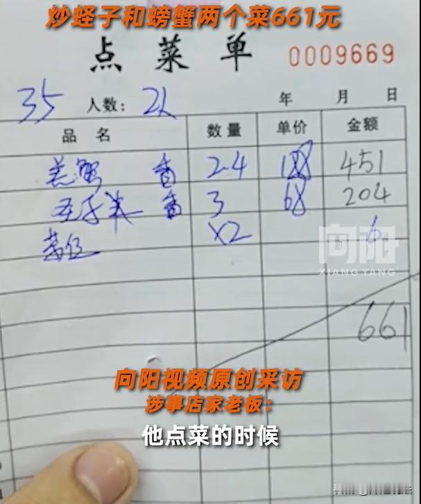广东惠州,一位网友旅游时在一家餐厅吃饭,点了一份炒蛏子跟一份炒螃蟹。吃完饭之后,