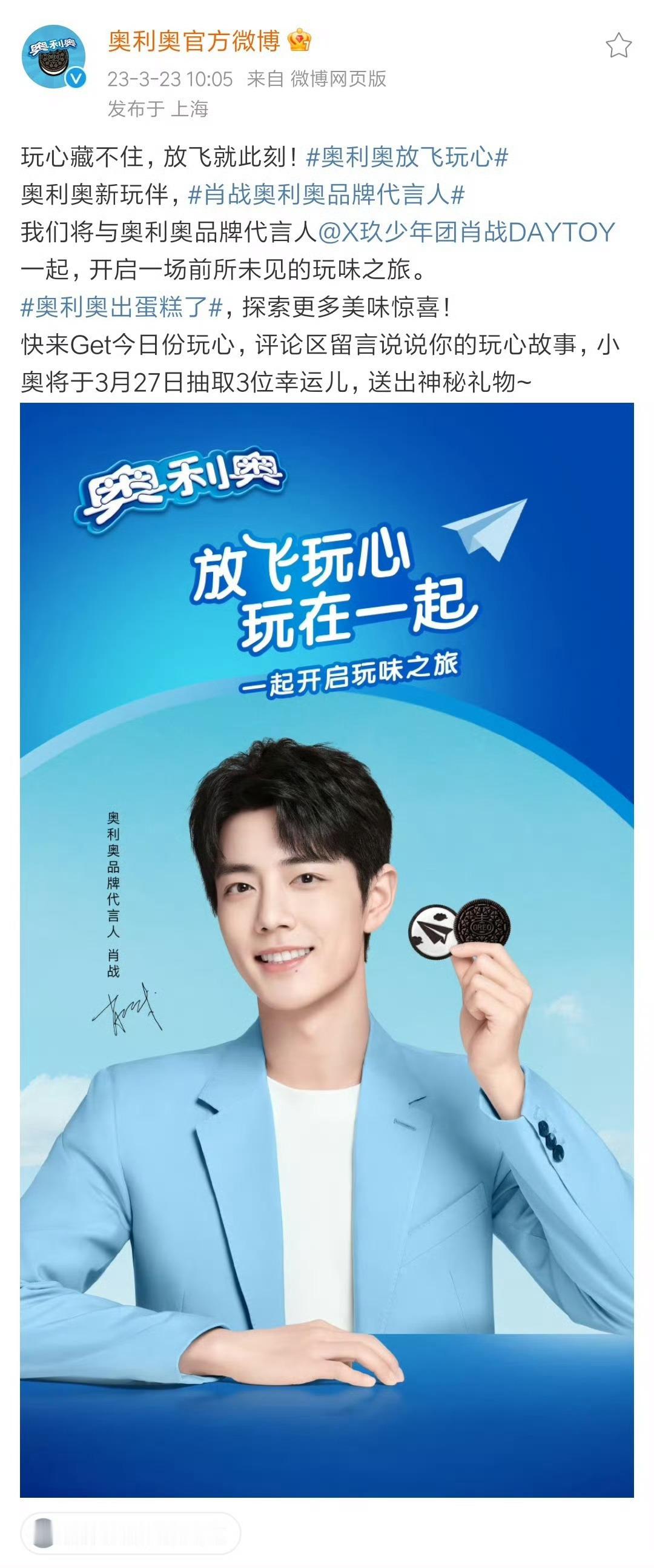 2023年3月23日,奥利奥官宣肖战担任品牌代言人。