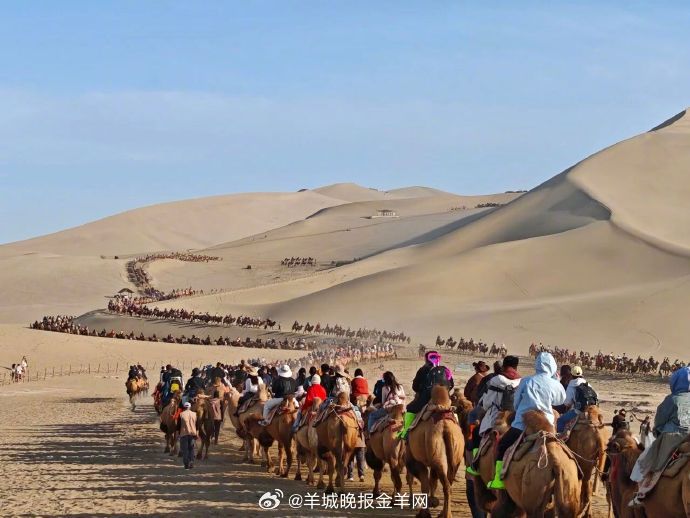 【#西出阳关人人人人人#】#西出阳关都是人#这个国庆中秋假期,各大景区人头攒动。甘肃省敦煌市的鸣沙山月牙泉景区迎来大批游客,再次出现“堵骆驼”的情况。有网友打趣道:“告诉王维,西出阳关全是人。”广东广州,“人人人人广州塔人人人人”冲上热搜。浙江天目山景区达到最大承载量,连续多天发布游客限流公告。河南龙门石窟发布公告表示,已接近最大游客承载量,采取必要入园管控措施,关闭线上、线下售票窗口。#假期余额不足#这个假期你去了哪里?来评论区聊聊↓(综合鸣沙山月牙泉、广州日报、天目山、龙门石窟)