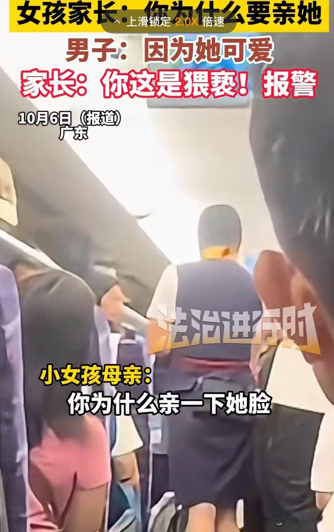 广东肇庆,30多岁男子座位挨着小女孩。见女孩模样可爱,他先是亲了亲女孩脸颊,又伸