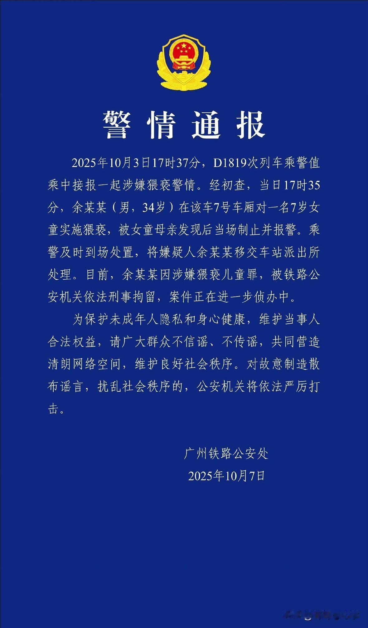 动车上猥亵7岁娃?这畜生必须往死里罚! 34岁的大男人,在动车上对7岁的小姑娘下手,还是人吗? 10月3号那天,D1819次列车上,这姓余的玩意儿在7号车厢,对着个才7岁的孩子做龌龊事,还好被孩子妈妈当场撞见、死死拦住,立马报了警。乘警来得快,当场就把他拿下了,现在已经刑事拘留。 想想都让人浑身发毛——动车车厢里人来人往,他居然敢这么嚣张?那可是个才7岁的孩子啊,啥都不懂,就该被好好护着,怎么就成了这种人渣的目标? 孩子妈妈得多心疼多后怕?当时得鼓起多大的勇气才能冲上去制止?换作哪个当妈的,遇到这种事估计都想跟他拼命。 这种人根本不配叫“人”,就是披着人皮的畜生。对未成年人下手,突破的是底线里的底线,必须重判!让他知道,敢碰孩子一根手指头,就得付出一辈子都爬不起来的代价。 也提醒所有家长,带孩子出门千万绷紧弦,别让孩子离开视线范围。遇到不对劲的,别犹豫,该喊就喊,该报警就报警,对这种恶徒,心软就是对孩子残忍。 希望警方严查到底,必须给孩子和家长一个交代,也给所有坏人一个警告:动孩子,没好下场!