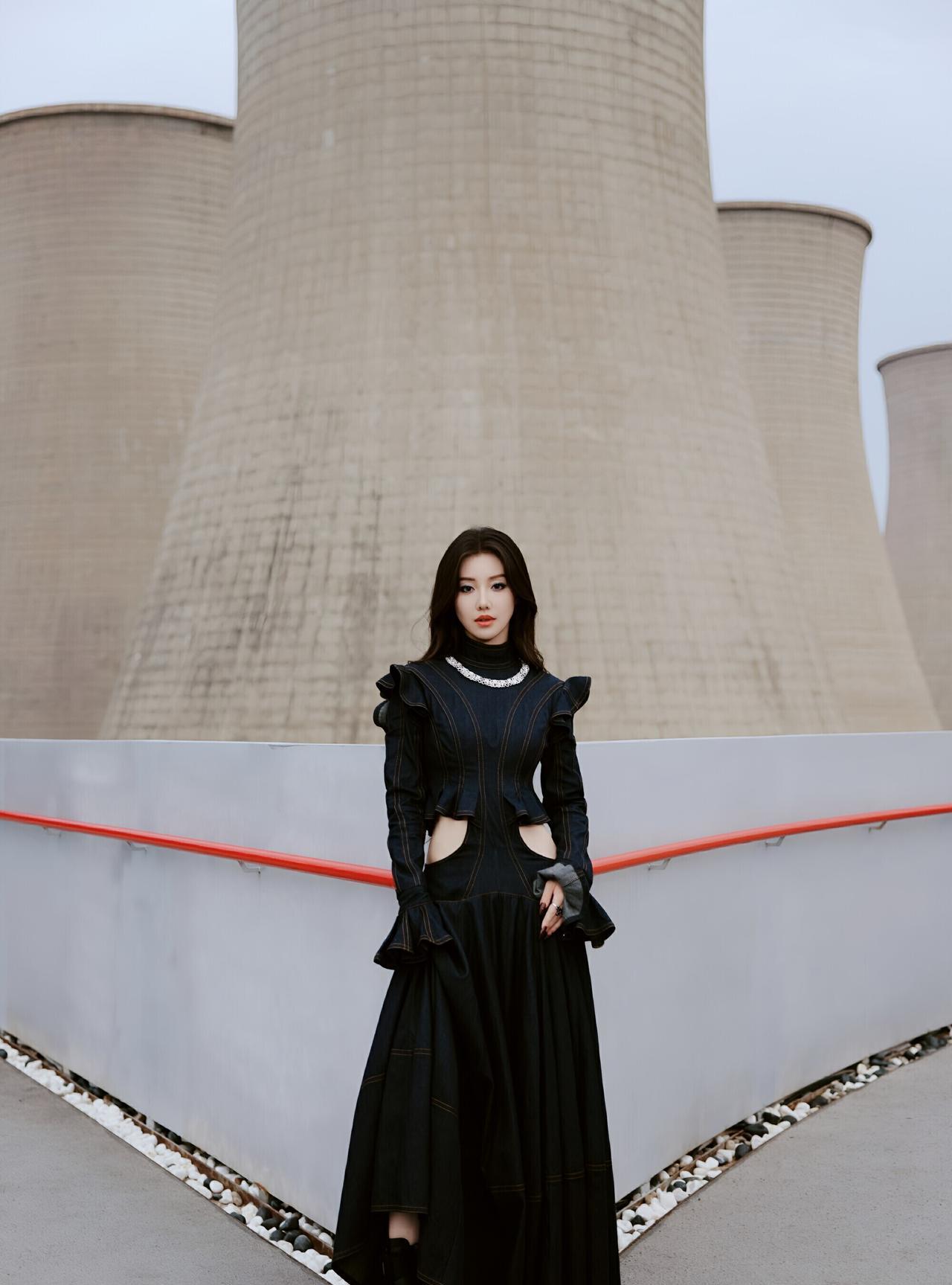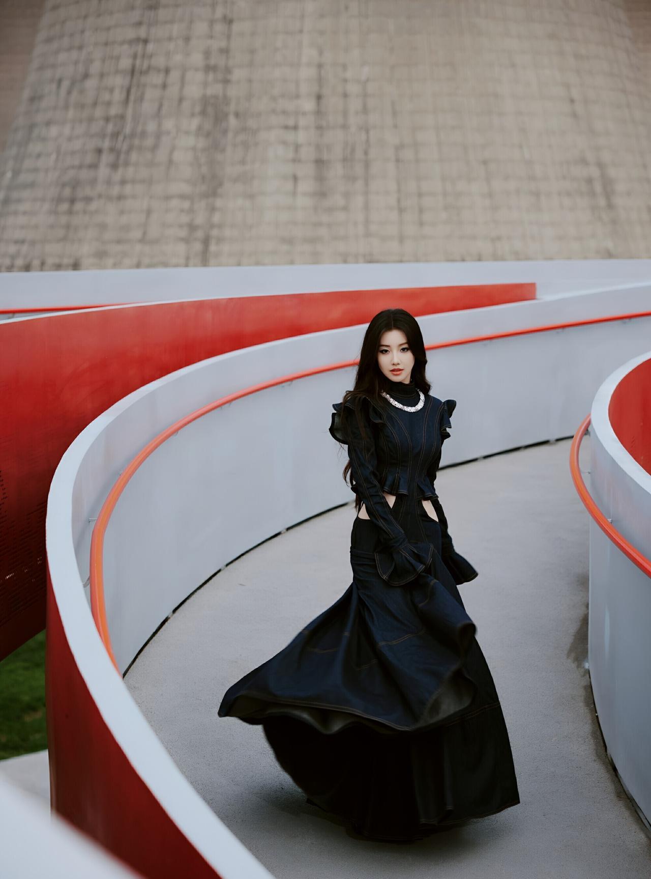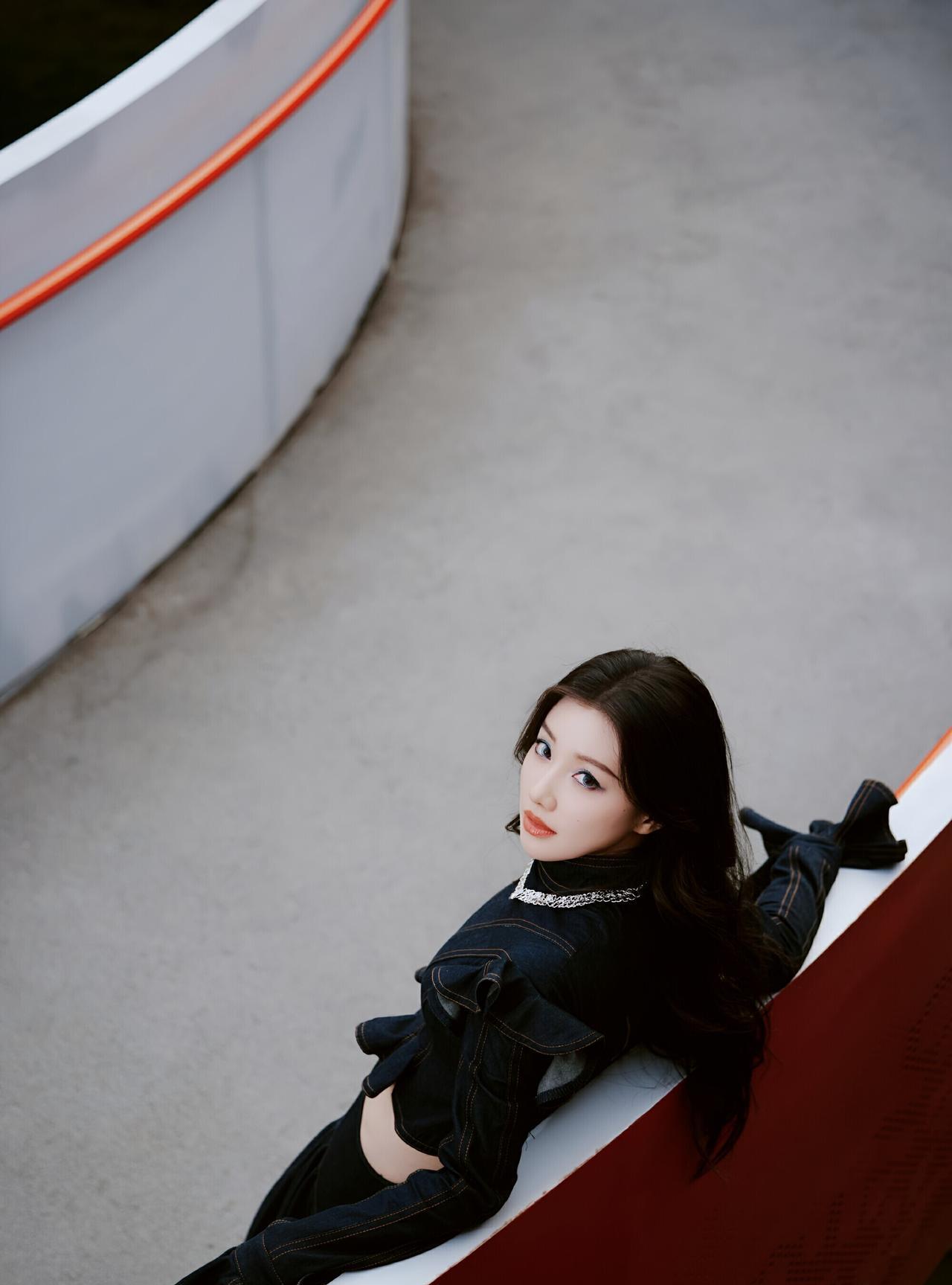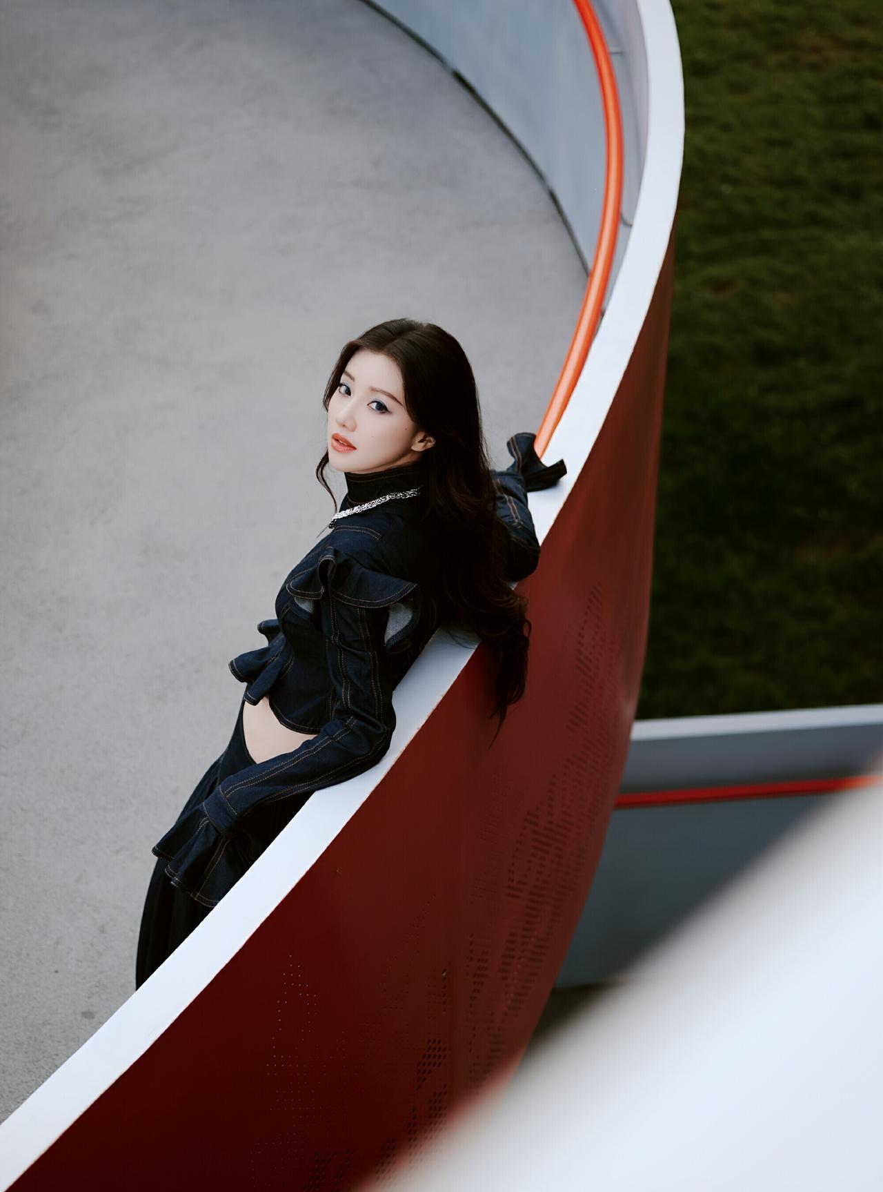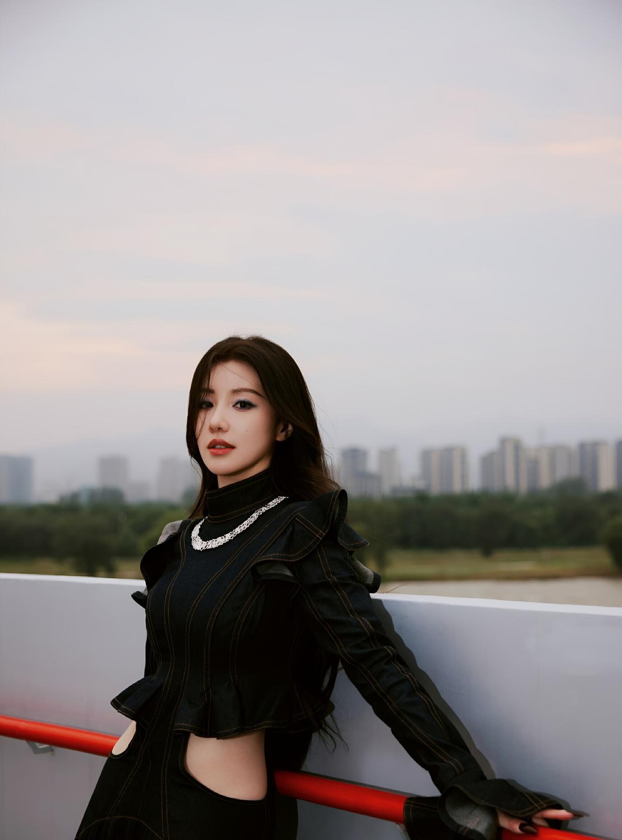 王鹤润个性时尚造型:牛仔套装荷叶边与镂空设计吸睛,红白弧道间上演时尚大秀