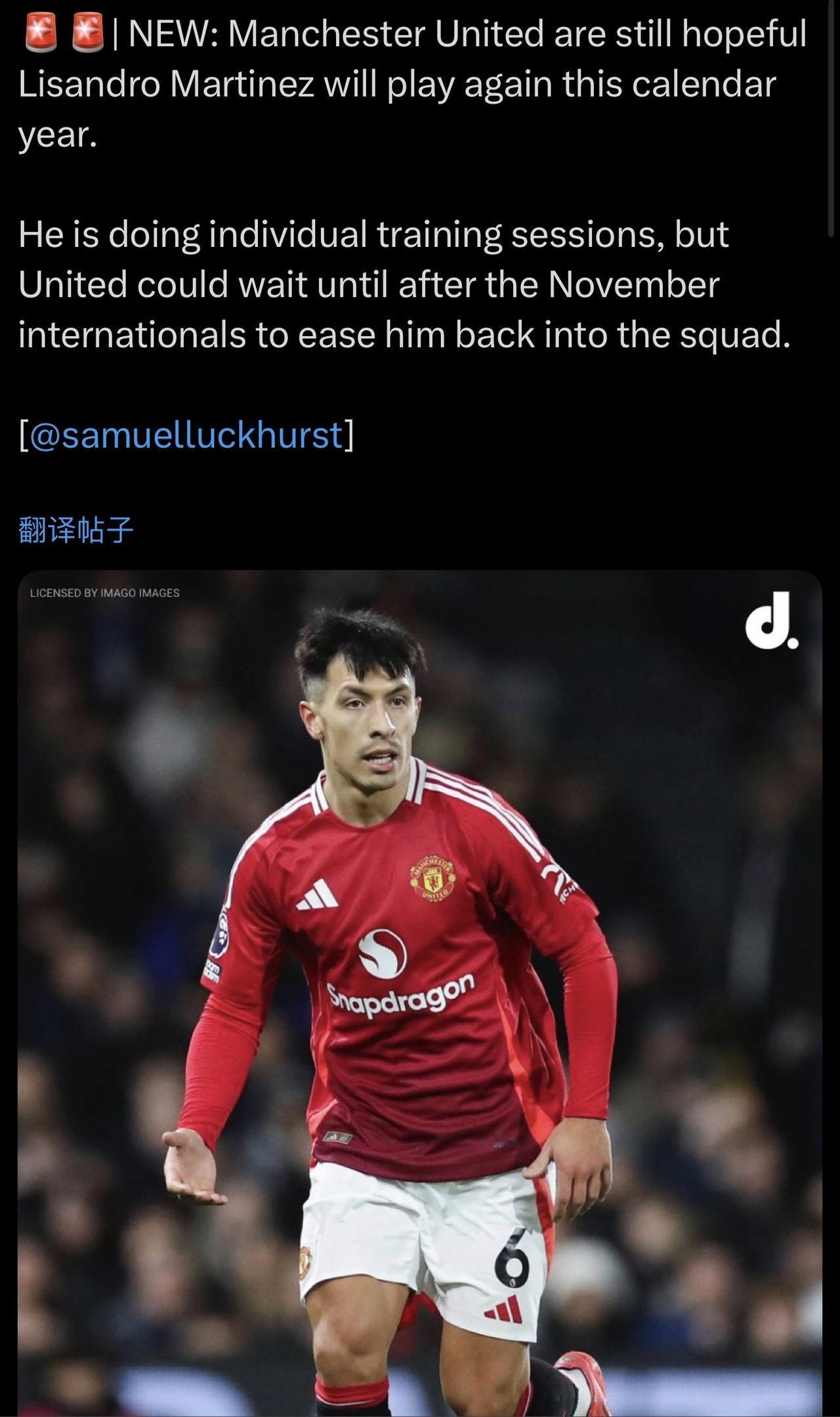 我以为利马能很快复出[捂脸],结果原计划2025年不会出场,只是现在恢复进度不错,可能在11月底,或者12月上场[流泪]。 🔴最新消息:曼联仍然希望利桑德罗·马丁内斯今年能够再次上场。 🔴他正在进行个人训练,但曼联可能会等到十一月国际比赛结束后再让他重返球队。