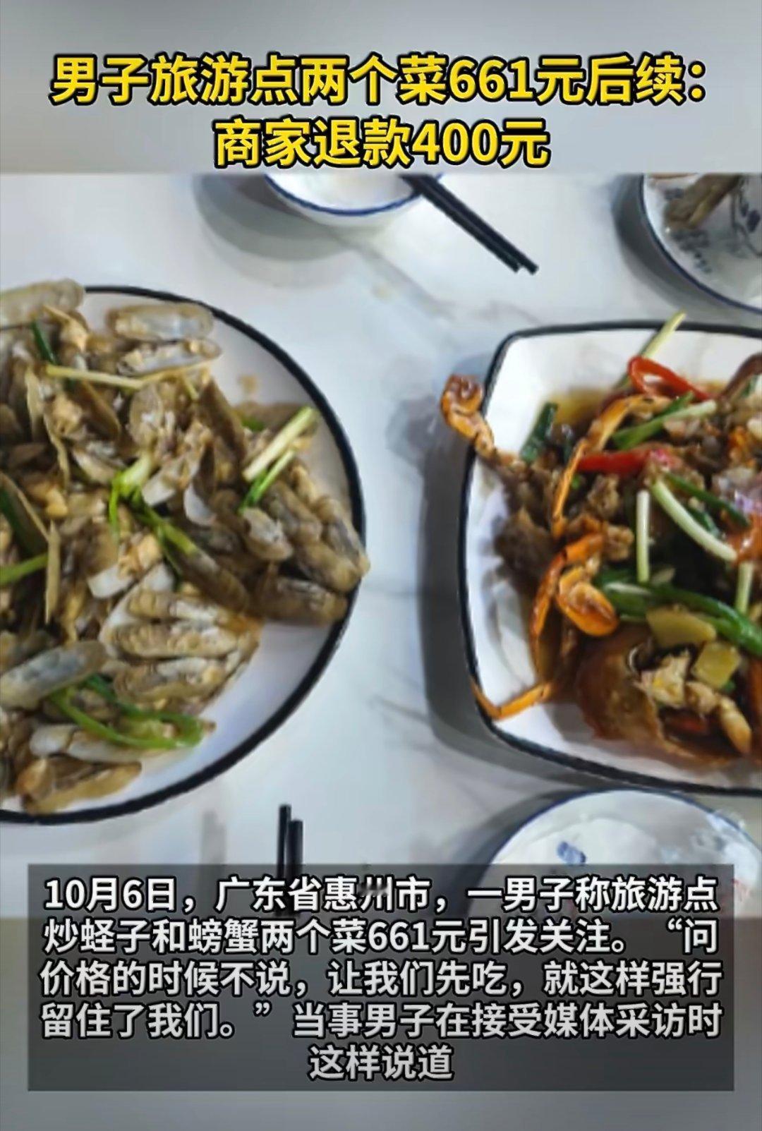 虽说节假日各类成本高一些,虽说可能在景区地方很多东西也都贵一点,虽说最后也退了400,但是这两个菜,退完261,也还是贵啊。