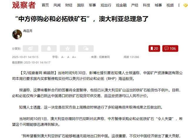 被中方反制后,澳大利亚才发现!据了解,本周中方已经将必和必拓美元计价的铁矿石全停了,连在海上飘的货都没例外,知道这个消息后,阿尔巴尼斯就公开喊“失望”,催着赶紧解决,国库部长更是急着找必和必拓老板谈。 这事儿得从澳大利亚铁矿石出口说起。澳大利亚是全球铁矿石头号供应商,每年挖出来的矿石大半卖给中国,占了出口总额的五成以上。必和必拓、力拓这些巨头,靠着皮尔巴拉地区的矿山,赚得盆满钵满。2024年,铁矿石价格一度跌到每吨80美元以下,但澳方还是觉得稳,因为中国钢厂需求大,建高铁、造房子,总得用矿。中国作为全球最大钢铁生产国,一年吞掉八亿吨铁矿石,澳洲的份额稳稳的。澳经济高度依赖这个,矿业贡献了GDP的10%,西澳州更是一根独大。政府预算里,铁矿石税就占了三成,失业率低也靠矿工岗位。可这种依赖,像坐过山车,价格一波动,就全乱套。 中方这次暂停采购,不是随便玩玩。中国矿产资源集团作为国有大买家,向钢厂发了通知,全停必和必拓的美元计价海运铁矿石。新合同别签了,已在路上的货也别要,转向巴西或非洲货源。这决定来得快,9月底就传出,10月初正式落地。为什么针对必和必拓?据报道,是因为定价纠纷。必和必拓坚持美元结算,忽略了人民币汇率波动,中方觉得不公。过去几年,中澳贸易摩擦不断,澳洲禁华为,查煤出口,中方就反手加税。现在铁矿石成了新战场。中国不是没货源,巴西淡水河谷产量大增,2025年预计一亿吨以上,非洲几内亚的西芒杜矿也开工了。中国进口渠道早多元化了,澳洲份额从九成降到七成左右。这底气足,停购不伤筋骨,反倒逼澳方让步。 澳方反应快得像烫手。总理阿尔巴尼斯10月1日就公开表态,说这事儿“令人失望”,希望市场正常运转,别影响贸易。他在议会强调,双边对话是关键,赶紧坐下来谈。国库部长吉姆·查尔默斯更直接,马上约了必和必拓CEO迈克·亨利,讨论定价和结算问题。亨利飞悉尼,两人碰头,焦点在美元 vs 人民币上。澳政府担心连锁反应,铁矿石价格已跌2%,ASX矿业股集体下挫,必和必拓市值蒸发几十亿澳元。西澳矿工岗位不稳,预算赤字可能扩大。阿尔巴尼斯政府上台三年,本想稳经济,结果贸易战又起。他推动AUKUS联盟,军售美国,可经济上还得靠中国。这矛盾让澳方进退两难。 经济影响不小。澳大利亚铁矿石出口去年创纪录,价值1400亿澳元,中国买走八成。今年上半年还好,可这暂停一出,第四季度出口量预计缩水20%。必和必拓铁矿业务占公司收入四成,股价一周跌5%。力拓也跟着抖,澳洲矿业巨头全线承压。政府财政吃紧,铁矿石特许权使用费是主要收入源,少了这个,基础设施投资就得砍。就业上,西澳矿区上万工人,停工风险高。澳元汇率已贬值0.5%,通胀压力加重。查尔默斯在采访中说,这暴露了经济脆弱性,太依赖单一市场和资源。澳方得加速多元化,找印度、东南亚买家,可短期难顶上。中国需求这么大,谁敢轻易丢? 中方这招,根子在供应链重塑。中国钢铁业升级,推绿色生产,铁矿石需求转向高品位矿。澳洲的皮尔巴拉矿品质高,但运费贵,巴西的更便宜。中国矿产集团整合采购,过去钢厂散买,吃亏多。现在统一谈判,议价权强了。2025年,中国铁矿石进口总量预计9.5亿吨,澳洲份额降到六成半。巴西增三成,非洲新矿投产。这布局早几年就做了,疫情时就加速。澳方过去躺赚,矿价高时不管不顾,现在才醒,结构性问题暴露无遗。过度靠资源出口,像一腿走路,风浪一来就歪。 澳政府下一步怎么走?阿尔巴尼斯呼吁中方重启进口,无阻碍贸易。外交部通过渠道沟通,商务部也介入。查尔默斯和亨利谈后,必和必拓表态,愿意调整结算方式,考虑人民币选项。公司内部已通知供应商,短期库存够用,但长期得谈拢。澳方还推矿业峰会,邀巴西、印度代表,探新市场。可现实是,中国占全球铁矿需求七成,绕不开。阿尔巴尼斯在G20前夕表态,希望短期解决,别影响峰会氛围。澳经济学家估算,如果停购持续一个月,损失50亿澳元。政府已备预案,补贴矿企转型,可资金有限。