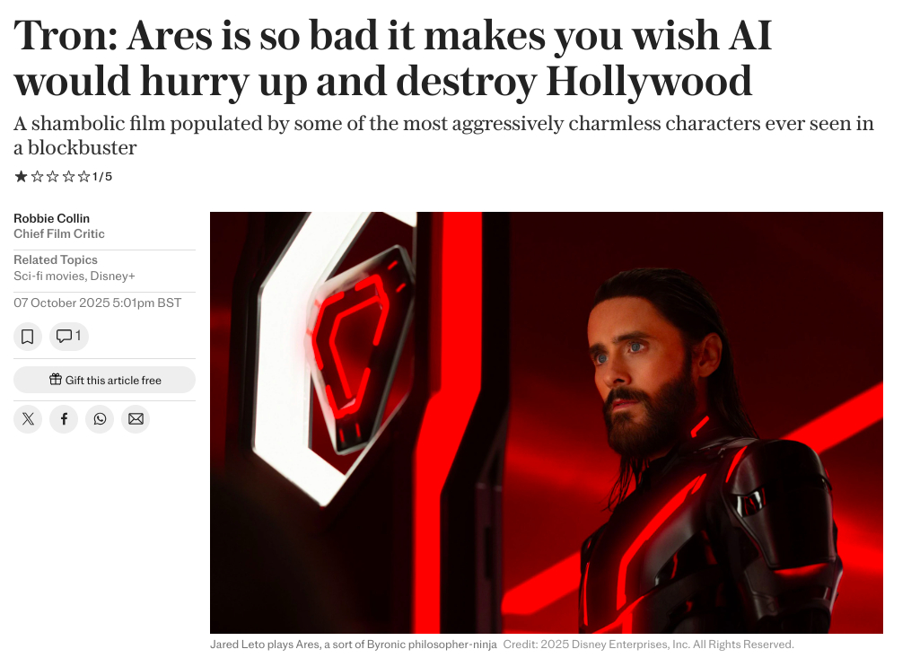 《每日电讯报》:烂到我真希望AI可以直接毁灭好莱坞