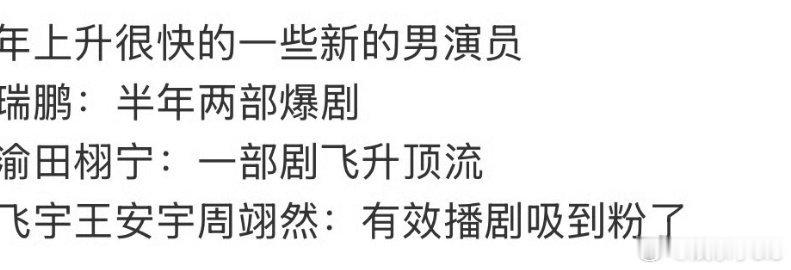 今年上升很快的男演员敖瑞鹏、梓渝、田栩宁、陈飞宇、王安宇、周翊然还得是电视剧抬人