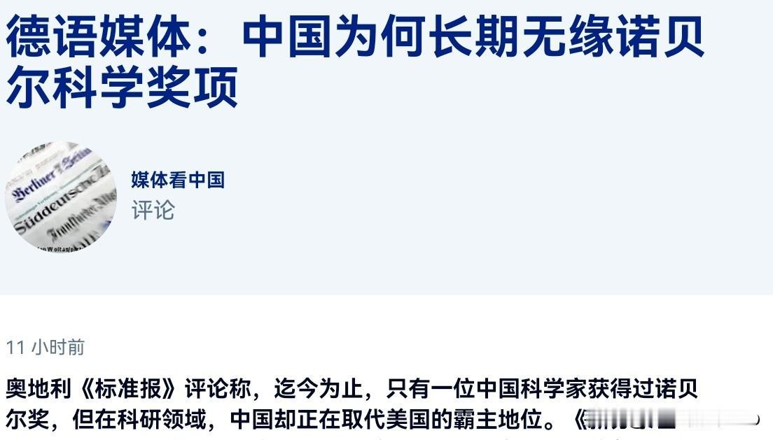 罕见!在中国科学家再次无缘诺贝尔最高奖项之后,德媒表示,以诺奖看待中国,这是对中国巨大的低错估,中国事实上正在成为欧洲学习和研究的对象。10月8日,德国之声刊文表示,迄今为止,只有一位中国科学家获得过诺贝尔奖,但在科研领域,中国却正在取代美国的霸主地位。德媒表示,某项科研获得突破几十年之后,往往才能获得诺贝尔奖。 诺贝尔奖更多地是在映射过去的科研状态,而非当下。而就今天的科研水准而言,中国正在逐渐取代美国的地位。德媒表示,不管是科研的质与量,中国都已经超越了美国。其一,2024年,中国大陆发表了近90万篇科学论文,在G20各国中名列第一。其二,统计全球最具影响力的150种自然科学和医学期刊,中国的这一指数也已超越美国。 德媒表示,在中国快速追赶美国,争夺全球科研领域霸主地位的同时,越来越多的欧洲科学家已经意识到,中国不仅是竞争者,同时也正在成为值得学习的创新中心。很显然,在中国科学家再次无缘诺奖之后,德媒倒是罕见的替我们说好了。德媒的意思很清楚,诺贝尔奖更多的反映的是过去的科研成就,而并非当下的科研实力。 德媒传递的信息非常的明确,那就是中国在科研领域的实力绝不能低估,反而欧洲应该重视中国的科研,向中国学习。当然,从我们的角度而言,德媒说的无疑是实情。事实上,不管是科研经费的投入,理工科人才的数量,还是对于科研的重视,我们绝对是处于全球领先的行列。我们的诺奖获得者数量确实太少,但是这不意味着我们的科研能力落后,相信在未来我们国家会涌现出非常多的诺贝尔奖获得者。