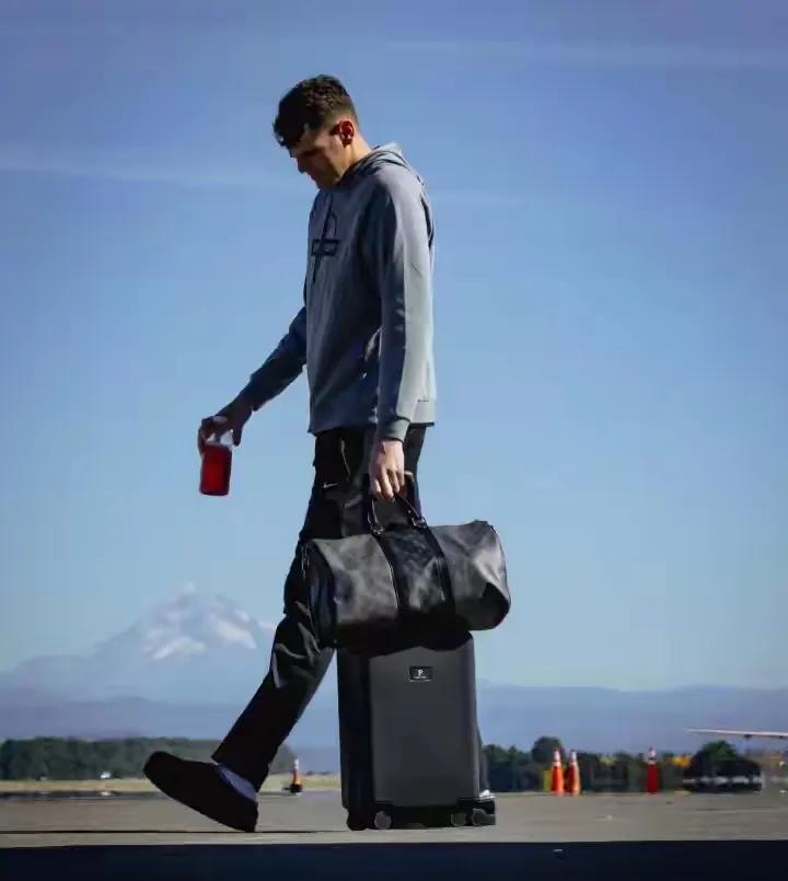 首秀10月9日开启,杨瀚森背上专属粉色小书包登机出发,开拓者官方首页晒杨瀚森照片