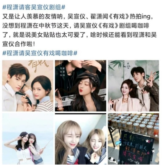 吴宣仪和孟美岐参加内娱选修的时候,双方闹得就很不高兴了,粉丝更是打的不可开交,现在吴宣仪在拍她的女主戏,程潇请吴宣仪剧组喝奶茶,很显然粉丝并不满意,不但发吴宣仪黑称,还提醒吴宣仪记得回请,然后程潇被对方粉丝笑话没戏拍,粉丝行为,偶像买单,但是有时候粉丝是站在偶像对立面在行事。