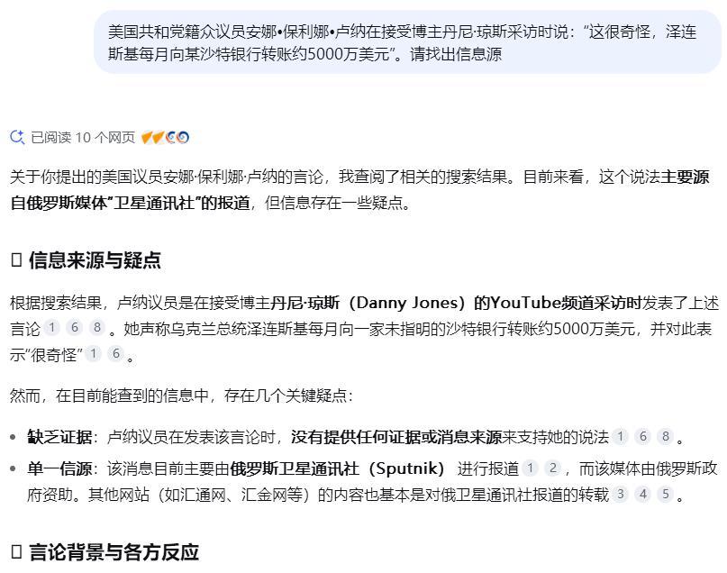 我清DeepSeek找出以上信息源,回应内容是:关于你提出的美国议员安娜·保利娜·卢纳的言论,我查阅了相关的搜索结果。目前来看,这个说法主要源自俄罗斯媒体“卫星通讯社”的报道,但信息存在一些疑点。详细内容看图二、图三。