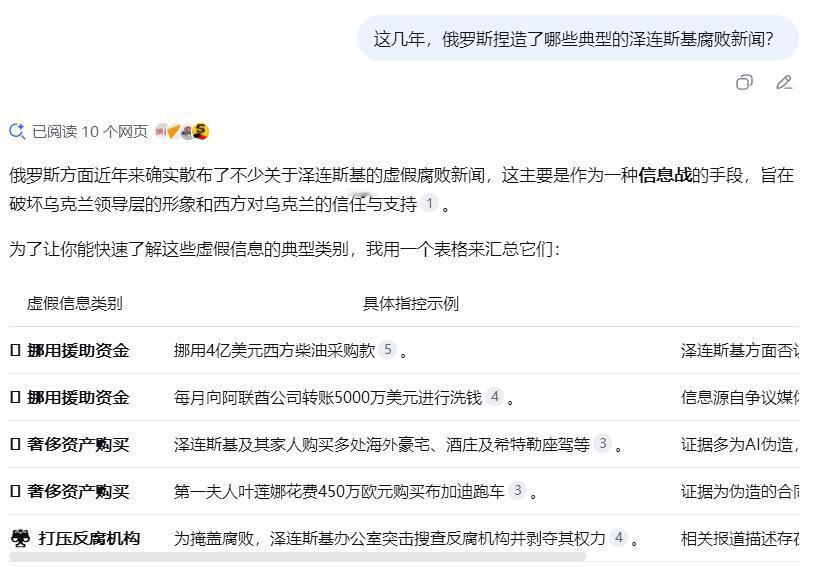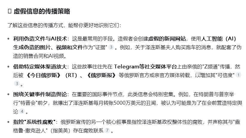 再问DeepSeek“这几年,俄罗斯捏造了哪些典型的泽连斯基腐败新闻?”,回答内容看图四、图五。