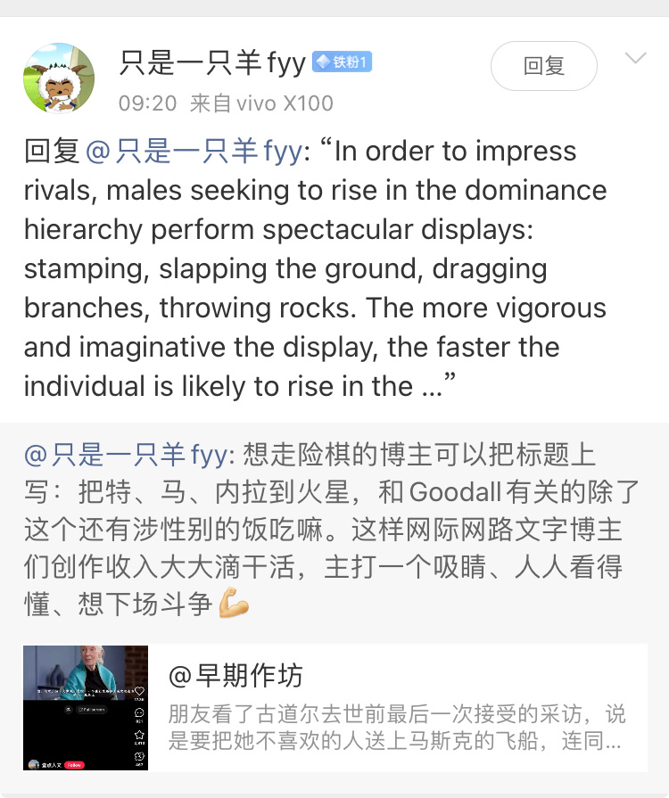 看看吧,挺可怜的,性别战争入脑入心入魂,附带输出英文高论。我本意是赞许珍妮·古道尔的现实关怀(看过完整版访谈的都知道那个名单有多敏感),这位女性主义者却认为我提点古道尔的政治观点是为了攻击她,是田力在吃性别流量