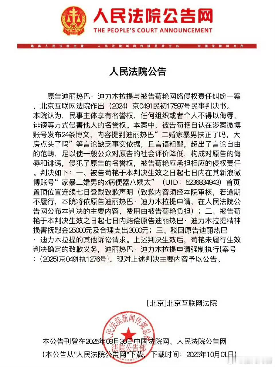 迪丽热巴告黑粉侮辱言论胜诉判决生效仍拒致歉?均因拒不履行致歉义务被迪丽热巴申请强制执行。支持迪丽热巴维权!网络不是法外之地!恶意诋毁他人就要付出代价。