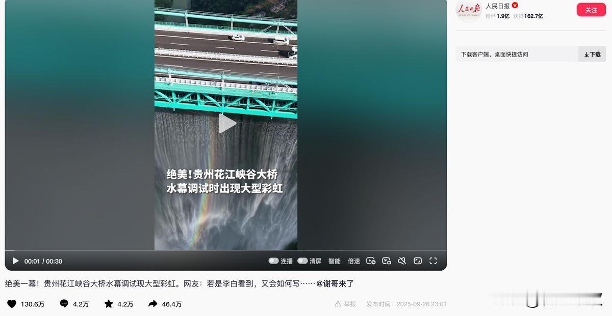 “解释不清了!”贵州,一男子准备用无人机拍摄花江峡谷大桥,结果,刚起飞就发现绝美一幕,水幕调试时,竟然在大桥下方,出现了大型彩虹,连老天爷都在为“世界第一高桥”增光添彩,飞流直下三千尺在这一刻具象化了,网友:若是李白看到,又会如何写…… 在贵州那连绵的群山里,藏着座能担起 “世界第一高桥” 名号的大家伙,花江峡谷大桥。九月下旬的一天,摄影师谢先生和王先生扛着无人机来这儿,想赶在大桥通车前,拍下它横跨峡谷的雄姿,毕竟是能在数据上 “横竖都排世界第一” 的工程,光是站在山脚抬头望,都觉得震撼。 俩人刚把无人机升起来,还没来得及调整好拍摄角度,就见桥身上突然往下淌水,原来是工作人员正在做水幕调试,625 米高的桥身,两道水流一泻而下,活像从天垂落的银河,没一会儿就把整个峡谷罩在蒙蒙水雾里,连远处的山尖都变得若隐若现。 谁能想到这水还不是随便抽的,是施工时发现的天然岩溶水,建设者们觉得扔了可惜,就环保地收集起来,没成想这次调试,倒成了一场奇景的 “引子”。 就在水雾最浓的时候,太阳刚好从云缝里钻了出来,角度不偏不倚,像是特意安排好的一样,下一秒,一道彩虹 “唰” 地一下就挂在了峡谷上空,红橙黄绿青蓝紫,连最淡的那抹紫色都看得清清楚楚,一点不含糊。 这彩虹也怪,一头正好搭在大桥的桥墩上,另一头稳稳落在对面的山腰上,把桥身上粗实的钢桁梁都轻轻绕在里面,远远看去跟画里的仙景似的,连风都好像停了,生怕吹散了这难得的画面。 谢先生和王先生当场就看呆了,一个举着无人机遥控器不敢动,屏住呼吸怕惊着这景,另一个想调镜头拍得更清楚,手都有点抖心里直嘀咕 “这也太巧了吧,解释不清了!”。 后来把拍好的视频往网上一发,立马就炸了锅评论区里全是惊叹的声音,有人说 “这哪是调试水幕啊,分明是仙宫往下倒水呢!” 还有人扯到了李白,“要是诗仙看见这 625 米的水幕配彩虹,估计《望庐山瀑布》都得重写,‘飞流直下三千尺’在这儿才真叫具象化了!” 其实这美景看着像老天爷随手赏的,背后全是实打实的硬功夫,你想啊这峡谷里的风力能到 14 级,刮起来能把人吹得站不稳,建设者们得靠多普勒雷达实时 “看” 风,用北斗系统精准定位,连高空拉主缆的细活,都是无人机 “穿针引线” 完成的,一点不敢马虎。 大桥的主缆里还埋了 “智慧神经”,光纤系统,24 小时盯着桥体的受力、温度和湿度,只要湿度超过 64%,智能除湿机就自动开工,确保大桥的 “筋骨” 始终健康。 那主缆里的钢丝,总长加起来能绕地球两圈多,对接的时候精度能卡到毫米级,差一丁点儿都不行,就连固定主缆的索鞍,都没走传统老路,改用了锻焊结构,重量轻了不少,抗压强度反倒提升了 44%,更让人佩服的是,连造锚碇用的混凝土,都掺了路基挖出来的白云岩碎石粉末既环保又省料,光这一项就省了五百多万处处透着巧劲。 当然再厉害的工程,最终还是要落到 “人” 身上,以前峡谷两岸的居民,要想跨过去,得绕两小时的盘山路,弯弯曲曲的,老人小孩走一趟都遭罪。 现在大桥通了,两分钟就能从这头到那头,通车那天有位老人站在桥边看了半天,只说了句 “这桥修得太神了”,简单一句话,却道尽了技术进步带来的实在改变。 现在这桥还成了网红打卡地,不少人专门开三小时车过来,就为了拍张水幕(要是赶巧能遇上彩虹,更是赚了),当地还借着这股劲儿搞起了 “桥旅融合”,有人开起了民宿,有人卖起了山里的土特产,日子都跟着活络起来。 那道突然出现的彩虹,没人能刻意设计出来,就是工程智慧碰上天时地利,凑出的一份妙不可言的巧合,大家说 “解释不清了!”,其实是解释不清这份巧合有多珍贵,既有大国工程的硬核实力,又有大自然的温柔馈赠,把桥修得又结实又好看,还能帮着老百姓把日子过好。 (信息来源:人民日报)