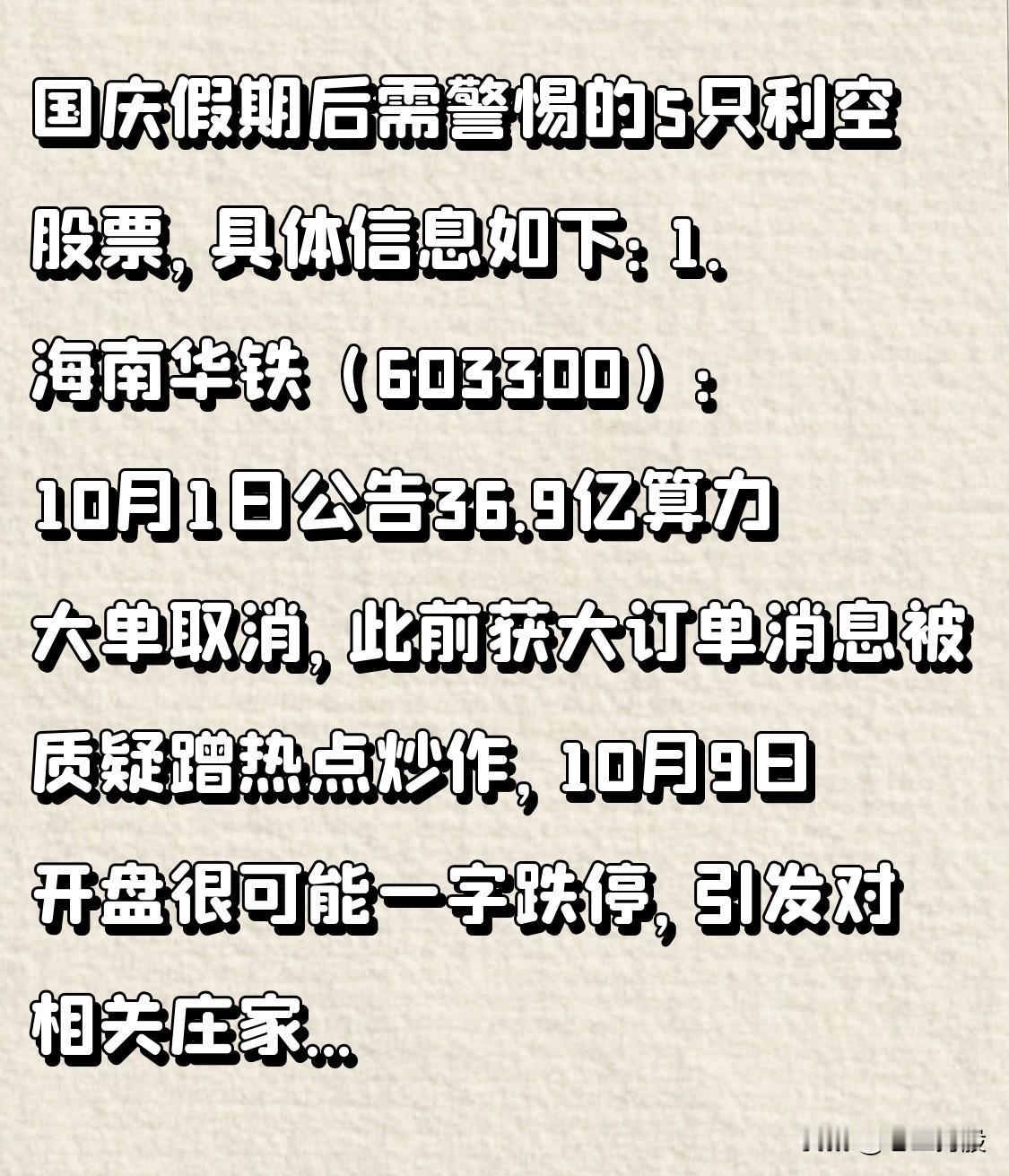 国庆假期后需警惕的5只利空股票,具体信息如下: 1. 海南华铁(603300):10月1日公告36.9亿算力大单取消,此前获大订单消息被质疑蹭热点炒作,10月9日开盘很可能一字跌停,引发对相关庄家的质疑。 2. 中际旭创(300308):英伟达向1.6T光模块供应商压价,且控股股东减持套现23亿,股价可能承压。 3. 新易盛(300502):控股股东减持套现41亿,叠加英伟达压价影响,算力光模块方向短期或调整。 4. 芯碁微装:控股股东、实控人程卓拟减持不超2.00%公司股份,较大比例减持或带来抛压,不利于股价上涨。 5. 润达医疗:股东拟合计减持不超3.99%公司股份,可能对公司股价产生负面影响。