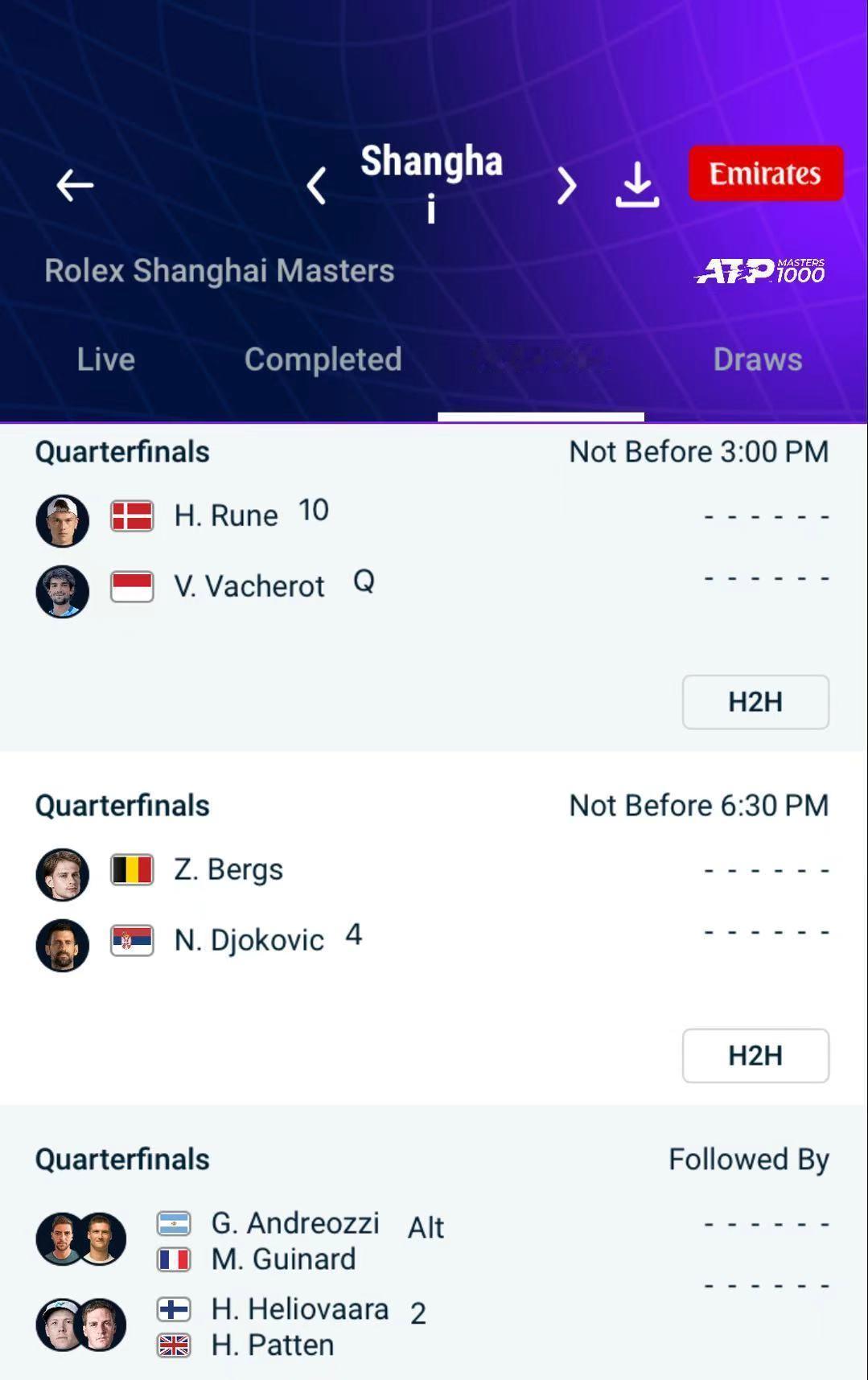 2025上海劳力士大师赛1/4决赛,小德 vs 贝尔赫斯,中心球场夜场第一场,不早于北京时间10/9号周四18:30分🙏🏻 idemo nole
