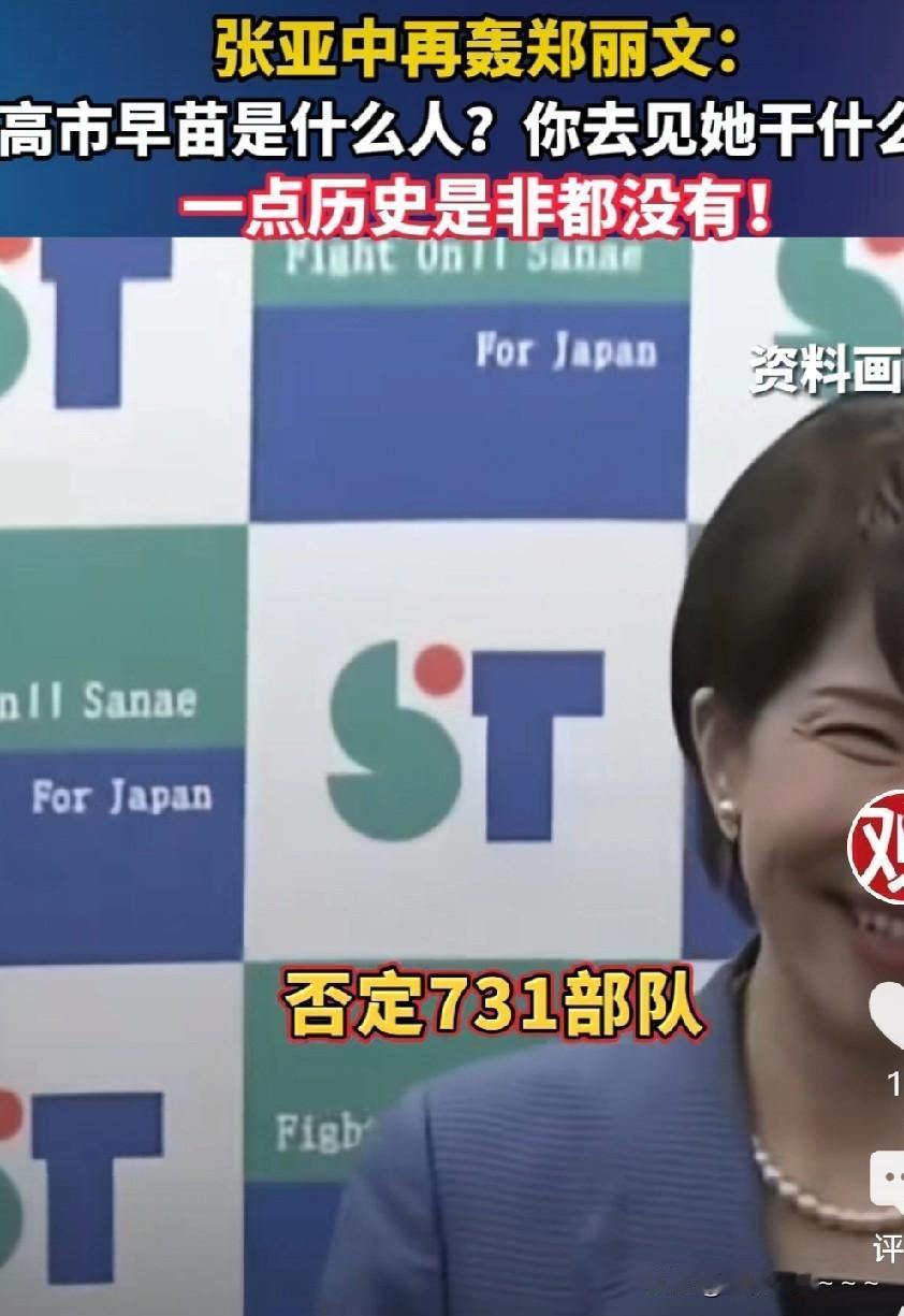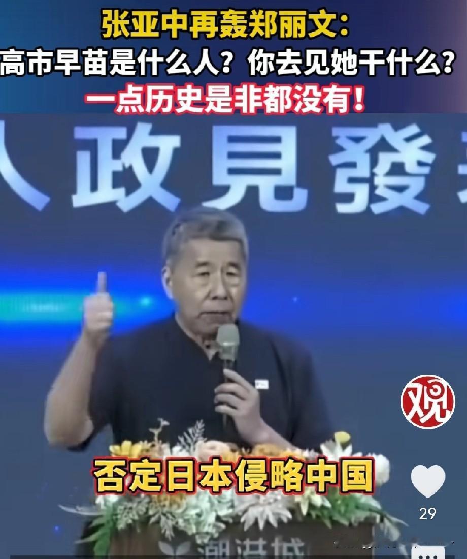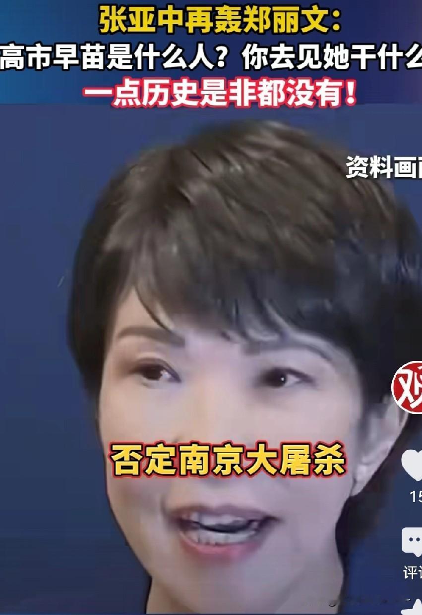 火力全开! 张亚中继续炮轰郑丽文,认为她不应该当选后去见高市早苗,高市早苗就是一个否定历史的人,做为国民党主席,你去见她干什么?一点历史是非都没有… 一点看法:不得不说,就凭这一点也要为张亚中点个赞。别看现在郑丽文有点优势,好多国民党大佬都在支持她,企图模仿韩国瑜去日本。即使她当选了,就凭她这一个想,说出来都会伤害民族感情,还别说去做了,那后果将是非常严重的,只要见了高市早苗,跟用针扎两岸老百姓的心有什么区别?