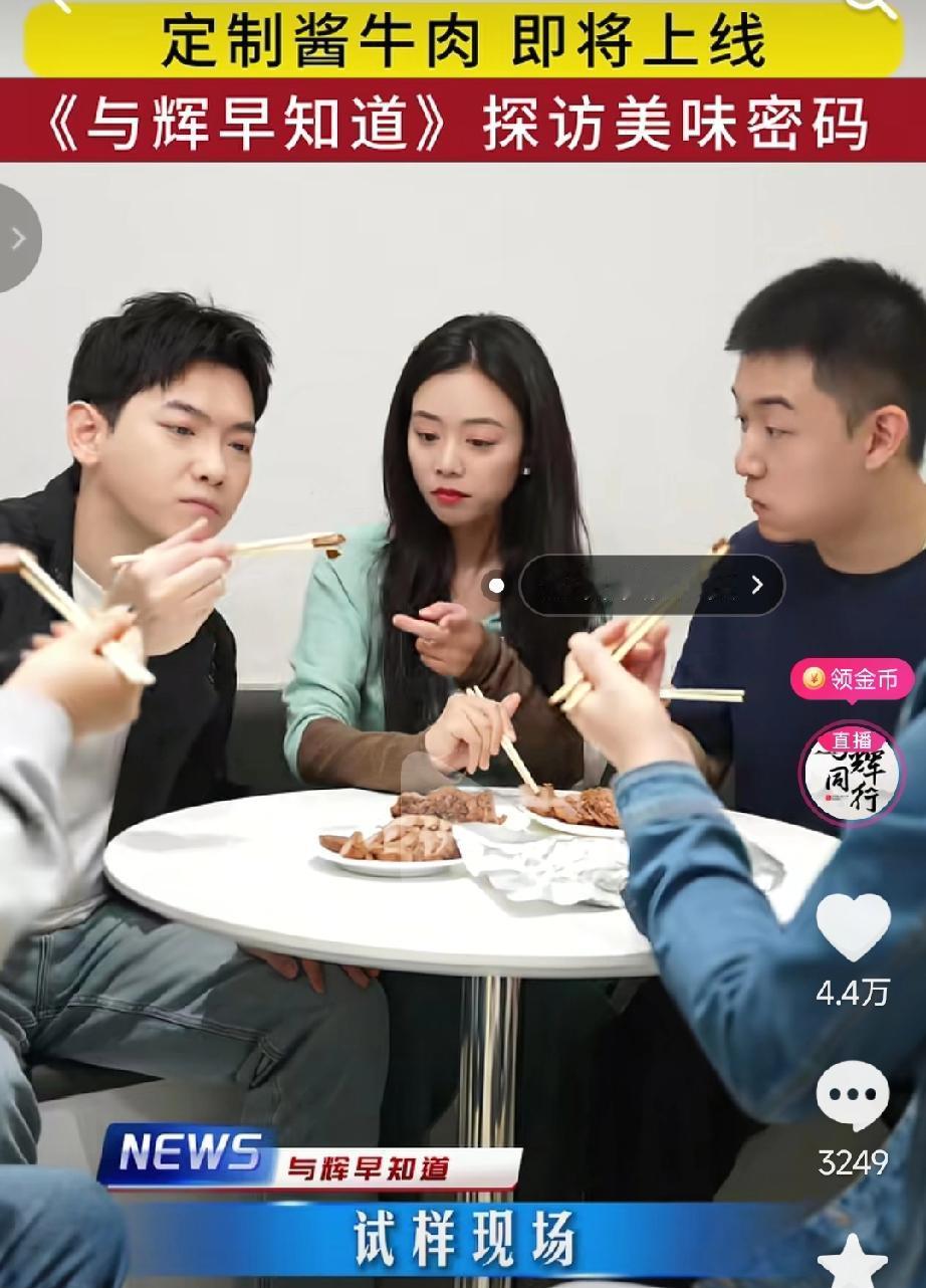 小贝、董董、传熙他们在吃什么呢,吃的那么香呢?原来是《与辉同行》定制的酱牛肉! 《与辉早知道》栏目官宣了《与辉同行》定的酱牛肉于10月9日19点正式上线。 与辉同行定制产品的试样现场,大家对一款酱牛肉赞不绝口,《与辉早知道》栏目组奔赴生产基地,探访美味密码。采访了与辉同行跟产人员。 原来在生产过程中,不仅采用最优质的牛肉,原辅料也安全有保障,还采用秘制配方,寻古法熬制,生产人员全程跟产,保证产品质量稳定。对每一个细节都非常用心,这大概就是美味的秘诀! 与辉同行每一个定制款的背后都付出了很大的人力、物力、财力,宇辉之所以这么做,就是为了把最好的东西呈现给大家,让大家买的放心、吃的安心、用的舒心! 很多网友现在就开始担心明天晚上抢不到酱牛肉了,有网友直呼少于50万单就别上了,上了也抢不到! 喜欢吃酱牛肉的朋友们,定好闹钟,准备开抢吧。记得一上链接就抢,千万不要等宇辉介绍了,我怕没介绍完,甚至还没开始介绍呢就抢完了。只要是宇辉上链接的,不用介绍,也可以放心的买!买!买! 祝喜欢吃酱牛肉的朋友们好运,都能抢到! 董宇辉 与辉同行 兰知春序 董董 小贝