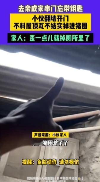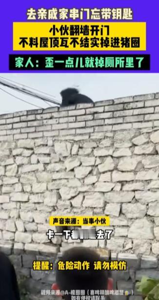 “离了个大谱!”10月5日,河北唐山,一男子和大姑一家出门吃饭,回来时大姑发现忘记带家里钥匙,男子试图翻墙帮忙打开门,没想到屋顶的瓦不结实,他掉进了猪圈里,旁边就是厕所,网友:幸好没掉进厕所里! 日常生活中经常有人一时粗心出门没带家里钥匙,这种事情发生城市里可能需要花钱找开锁公司,在农村的话就好办了,想办法进到院子里就能解决。 一男子跟着父母来到大姑家串门,中午大姑张罗着去饭店吃饭,酒足饭饱之后,大姑忽然发现自己没带家门钥匙,家里又没人,这可把她着急坏了。 这时男子的父亲提议,让男子翻墙进去把大门从里面打开,众人思考了一会,也没有更好的办法了,只能让他冒险试试,当时男子喝了点小酒,二话没说就同意了。 由于没有梯子,男子在亲戚的搀扶下踩着石砖的缝隙缓缓爬上墙头,正当大家以为大功告成之时,男子落脚的屋顶瓦不结实,一下掉进了猪圈里。 这可把众人吓了一跳,所幸男子的身体没摔出事,他将大门顺利打开,众人发现男子掉落的地方紧挨着厕所,要是歪一点儿就直接摔进厕所里了。 不少网友都庆幸男子没掉进厕所里,这要是不小心掉进去了得多糟心,出门前一定要检查好有没有遗忘的物品,如果不慎没带钥匙,千万不要学习男子的方法,优先保证自己的人身安全! 信息来源:《去亲戚家串门忘带钥匙,小伙翻墙开门不料屋顶瓦不结实掉进猪圈,家人:歪一点儿就掉厕所里了》大参考