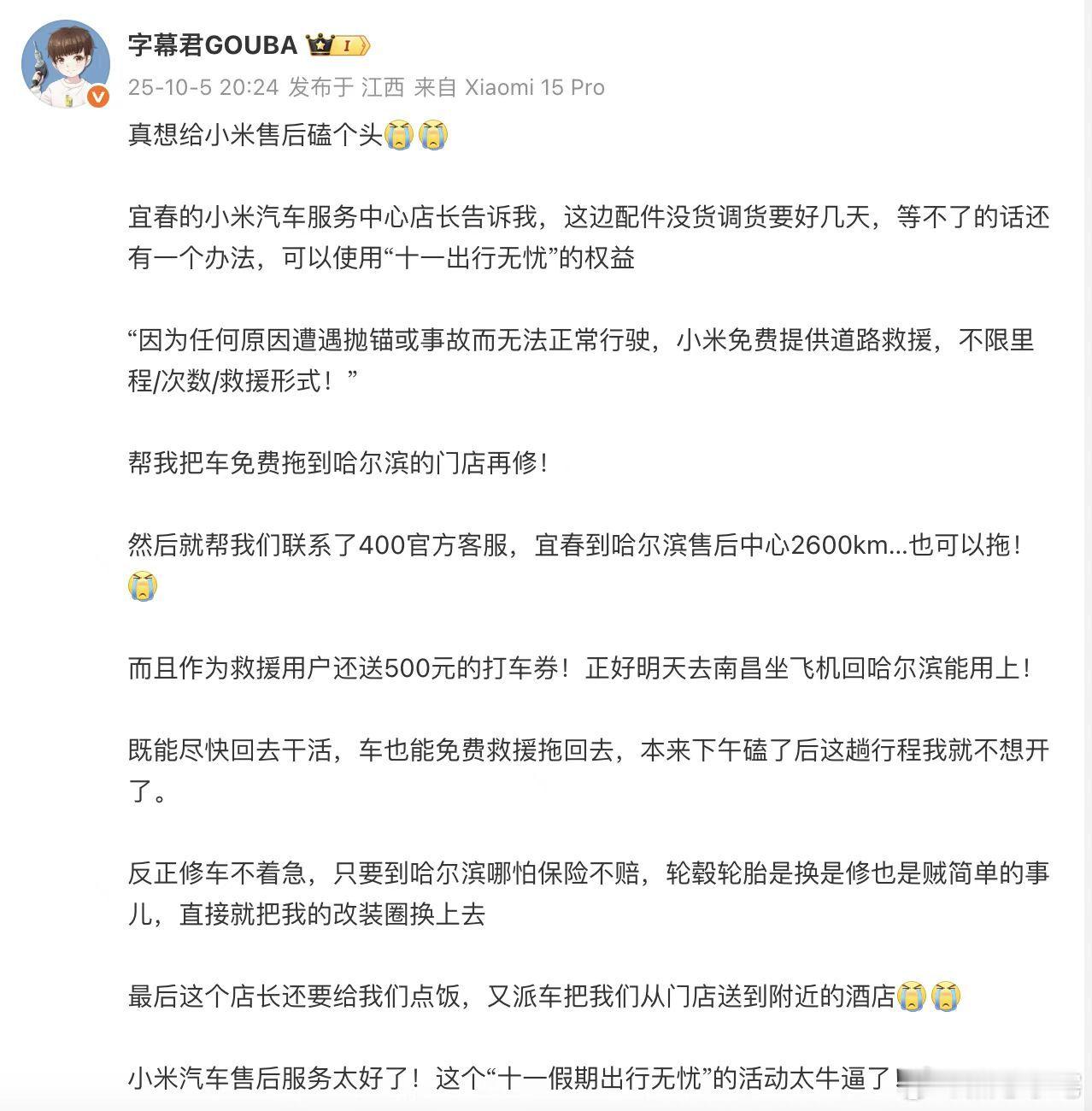 小米的服务虽然一直没得说,但是有车主从宜春到哈尔滨2600公里都能免费拖车,也是惊到我了,这可不是小数目。而且所有车主都能享受,不用买什么额外服务,这种实在的保障比什么广告都让人安心。