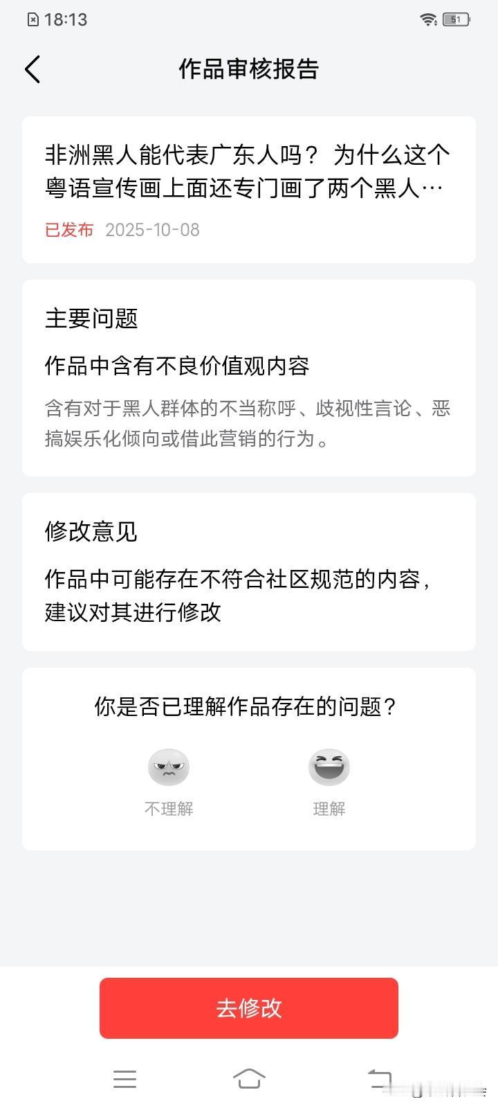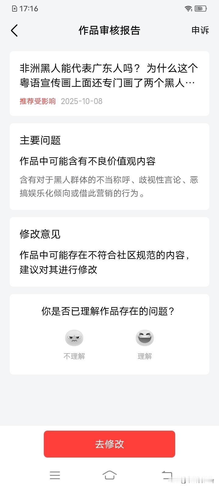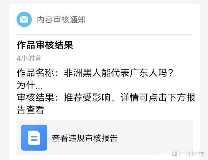 头条崇洋媚外! 故意打压创作者! 转发了一个抖音图文内容。 说了一下黑人凭什么能代表广东人宣传粤语文化? 结果马上就收到了平台的限流警告通知! 说我歧视黑人?宣传不良价值观? 我提供了原创作者的视频截图和作品链接,说明只是转发,并不违规! 结果仍然是申诉失败! 真是把我气笑了!