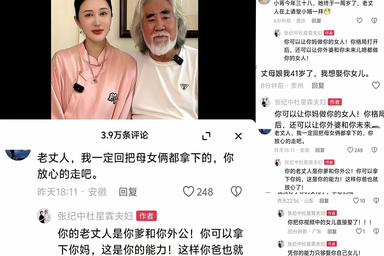 万万没想到 看到张纪中被网友怼的这句话,我真没忍住笑。 “你和老婆差31岁,你女儿将来找个大三四十岁的,你急什么?” 绝了,真的绝了。 老爷子给一岁的女儿写了封家书,本来挺温情一事儿。 结果评论区一堆人排着队喊“岳父岳母”,要把老爷子气炸了。 这届网友的脑回路简直像安装了反导系统,精准打击到张纪中最敏感的神经。73岁老导演在微博晒出给幼女“小龙珠”的深情家书,满屏父爱快要溢出来,评论区却秒变相亲现场,一群小伙子争着报名当女婿。 更绝的是有人搬出“因果循环”理论——既然你能娶小31岁的助理,凭什么不准女儿将来找大三十岁的对象? 张纪中家族谱比武侠剧还跌宕起伏。大女儿张语芯47岁掌舵爱奇艺,小女儿龙珠刚蹒跚学步,姐妹年龄差44岁堪比祖孙辈。 混血继子马丁是妻子杜星霖婚前试管所生,加上婚后生的嘟嘟和花花,五个孩子横跨三个代际。这家庭聚会场面,不知道的还以为是四世同堂拍摄现场。 老爷子可能忘了互联网有记忆。当年他牵着42岁妻子游浙江的照片全网疯传,杜星霖素颜憔悴身材走样,明显刚经历高龄剖腹产的消耗。如今却对网友的调侃暴跳如雷,倒像是只许州官放火不许百姓点灯。 其实大众调侃背后藏着严肃命题:当74岁父亲牵着3岁女儿逛街,外人总误以为是祖孙俩。这种跨代家庭要面对的何止是舆论?孩子成长过程中父亲日渐衰老,同龄人好奇的目光,还有未来沉重的照护责任……浪漫爱情宣言终究要落地到柴米油盐。 不过张纪中似乎早有准备。被骂上热搜后,夫妻俩反而更频繁晒家庭日常,用镜头证明“年龄不是障碍”。只是不知道等龙珠18岁时,91岁的父亲是否还能像现在这样,为她挡开全世界的恶意。 各位读者你们怎么看?欢迎在评论区讨论。