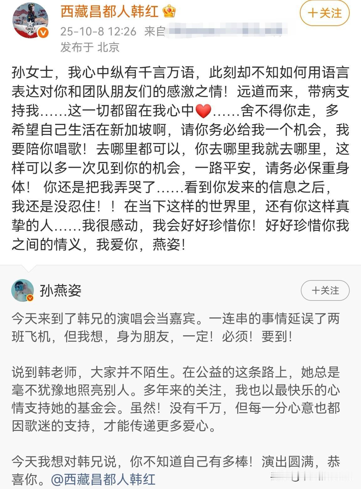 近日,歌手韩红在演唱会上爆料“孙燕姿常年匿名捐款超千万”。 10月7日,歌手孙燕姿发长文回应“捐款超千万”。 孙燕姿发文说道:“虽然!没有千万,但每一份心意也都因歌迷的支持,才能传递更多爱心。” 孙燕姿虽然生病了,但她坚持带病从新加坡飞到北京参加韩红的演唱会,真的特别有义气。 孙燕姿的发文有3个重要内容,我们一起来盘点一下。 一是孙燕姿作为韩红的好朋友,既然答应了做韩红的演唱会嘉宾,她就一定要做到。 二是孙燕姿点名韩红这些年为了公益付出更多,她也以快乐的心态支持韩红。 三是孙燕姿澄清捐款没有千万,并且感谢歌迷的支持。 韩红也转发了孙燕姿的动态,并回复道:“希望孙燕姿务必给她一个机会,她要陪孙燕姿唱歌。” 孙燕姿曾经红过,但她回归家庭后,人气大不如前。 如果不是韩红爆料,我们根本不知道孙燕姿一直在默默做公益。 希望韩红和孙燕姿友谊长存,这种纯粹的感情在娱乐圈已经不多见了。 对于孙燕姿匿名捐款,大家有什么想说的?