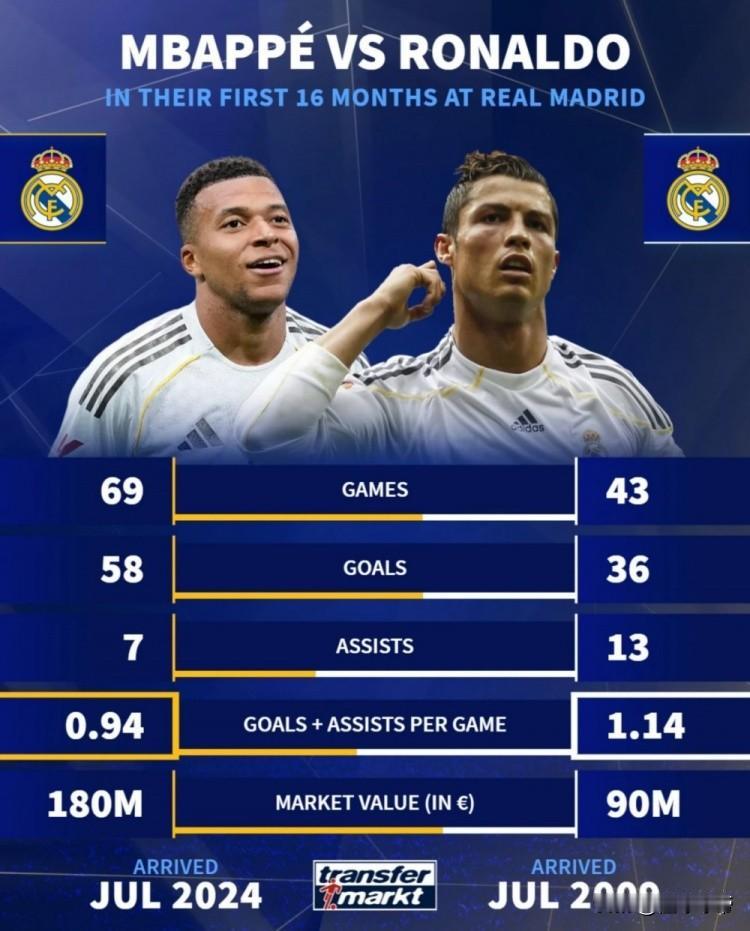 青出于蓝,姆巴佩在皇马比同期的C罗表现更出色! 不知不觉姆巴佩已经加盟皇马16个月了,在这16个月里,姆巴佩为皇马出战了69场比赛,打进58球送出7次助攻,场均参与0.94个进球。 而当年C罗加盟皇马得到前16个月里,C罗为皇马出战了是43场比赛,打进36球送出13次助攻,场均参与1.14个进球。 对比发现,姆巴佩在皇马的表现不逊于C罗,作为C罗最正宗的接班人,姆巴佩没有给偶像C罗丢脸,完全有能力扛起皇马未来十年。