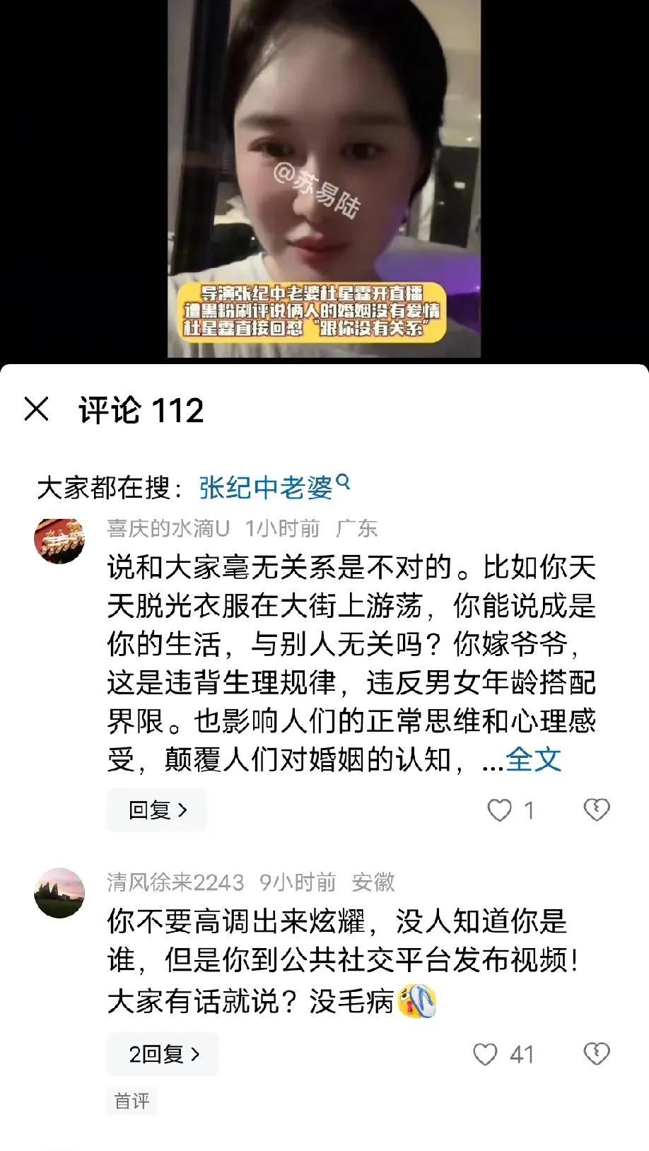 爱不爱的和网友没关系?!张纪中老婆杜星霖这样说就不太对了! 因为看到有网友评论说: 你爱嫁谁嫁谁,确实没什么关系,但是我的老婆看你在平台上秀恩爱,她提出和我分手,也想向你学习,找一个有钱的老头,这样是不是就和我有关系了? 还有网友说: 你不要高调出来炫耀,没人知道你是谁,但是你到公共社交平台发布视频,大家有话就说,没毛病! 看得出,网友们之所以对她和大她31岁的74岁导演张纪中。 婚姻里面究竟有没有爱情?比较关心,比较关注 可能是觉得他们作为公众人物。 在无形之中,已经或多或少影响到了社会上的男女婚恋价值观。 而且看看这位比老公小31岁的女网红的回复: 什么我们也没有抢了你的娘,也没有抢了你的女儿,说那些网友把自己的嘴巴收在自己家人身上。 这种回复明显看出来是一种怒怼了。 一些所谓的网络黑粉,当然也有比较过分,这种大可以拉黑屏蔽。 但是总觉得作为公众人物,对于网友们的调侃。 只要别人没有去恶毒的攻击辱骂,还是要有一定包容性的。 毕竟是公众娱乐人物。