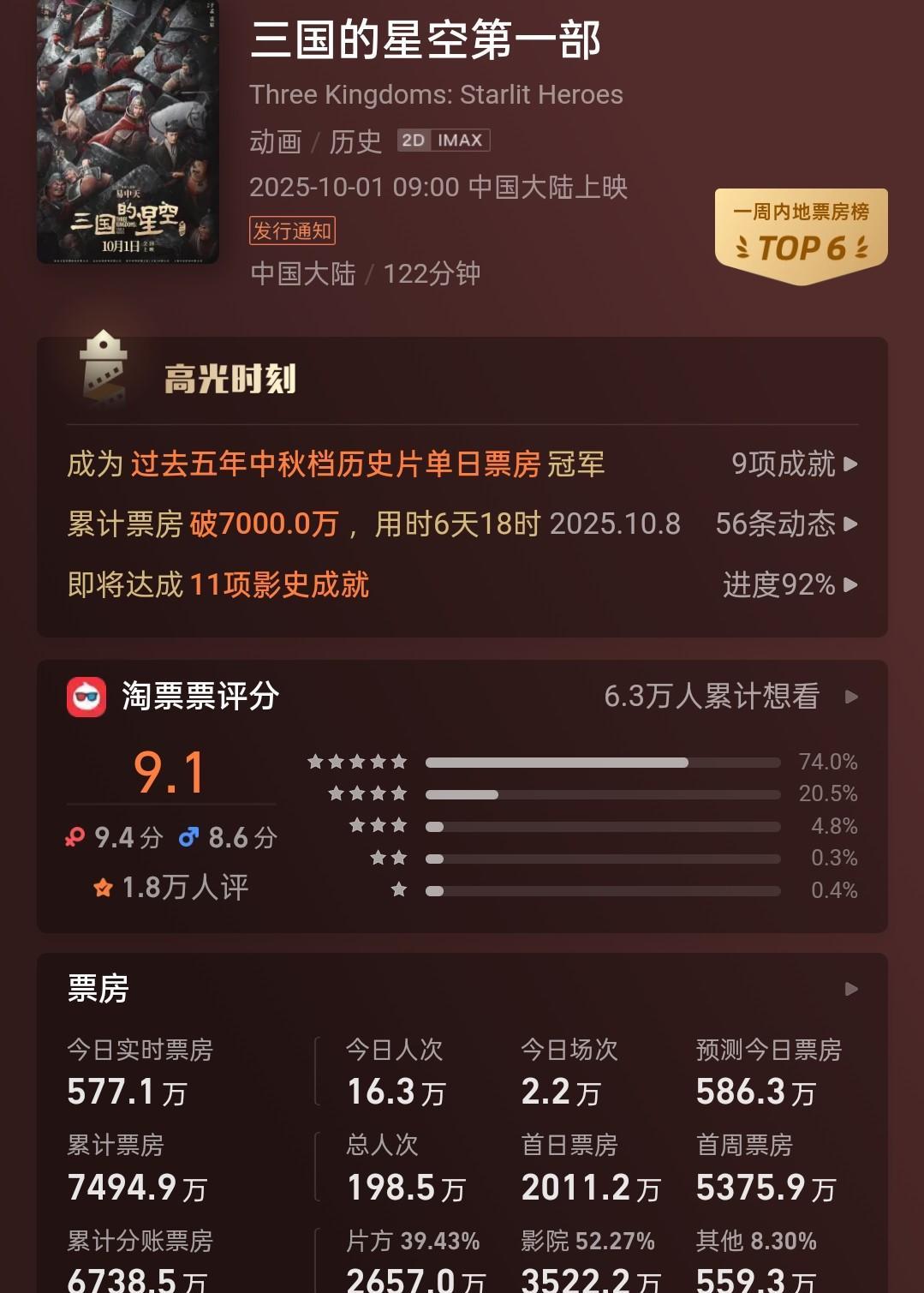 口碑7.2分,票房却仅有7400多万,《三国的星空》怕是不会有第二部了。 作为历史题材,没有创造《长安三万里》的票房奇迹,主要还是因为对曹操的呈现太另类化,并不是说对曹操不能有其他的理解,主要是作为曹操头号粉丝的易中天,很显然是夹带私货了。 我感觉,这个曹操应该字玄德,历史对他的评价是枭雄,这部动画对他的评价是伟光正,简直是百年不遇的大好人,尤其是曹操和汉献帝的关系,那一眼直接把他俩锁死了,这才是最暧昧的cp。 动画里,袁绍更像是曹操,曹操则更像是刘备,这才是动画的第一部,易中天还是太着急把曹操往伟大上靠拢了,一点缓冲都不给,观众很难一下子接受的。他应该徐徐图之,不能操之过急。 檀健次给曹操配音,票房很大部分是粉丝贡献的,看完只有一个感受,曹操就是汉室的第一大忠臣,那刘备算啥?#秋日生活打卡季#