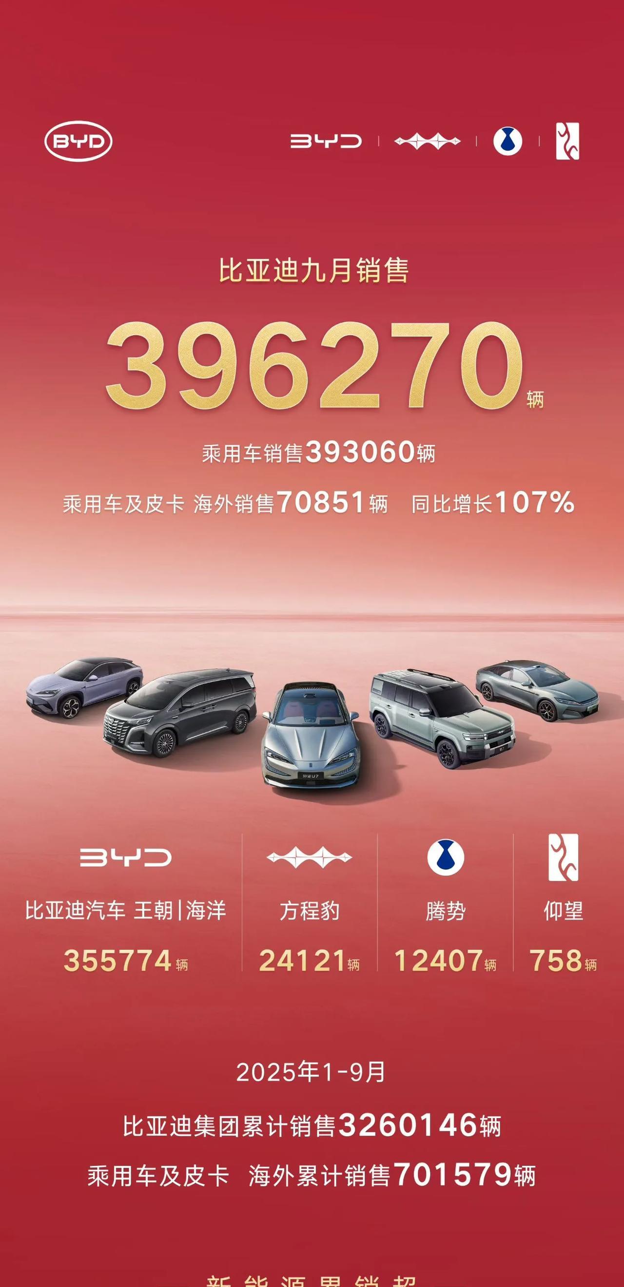 全球汽车格局大变化,中国汽车品牌比亚迪冲到前三,距离第二仅一步之遥 全球汽车销量榜出来了,在最新的一期中,8月份的销量中,前三甲都卖的很不错。 第一名是丰田68.18万 第二名是大众35.04万 第三名是比亚迪31.63万 丰田确实是猛,相当于两个比亚迪的销量了,丰田得益于全球化的销量,在东南亚,欧美都卖的挺好。 比亚迪在全球的销量中,目前国外销量占比比较低,主要是集中在国内,出口方面起来后,数据量就起来了。 根据这个榜单预测一下,今年比亚迪能够超越大众进入前二,今年9月份,比亚迪销量接近40万辆,今年整体已经突破360万辆。 等比亚迪搞定出口后,搞定国外汽车生产后,就会有一个质的飞跃,超越丰田也就几年时间了。预计5年内超越丰田是完全可行的。 在9月的销量中,比亚迪已经开始回暖了,整体来说,销量已经接近40万了,这个成绩的背后,是比亚迪对于核心技术是不懈努力得来的。 高端车方面,腾势和方程豹稳步上升,特别是方程豹钛7,一经推出,就得到了很多的好评,9月销量更是达到了8000多辆,完全不愁卖。 走量车型海狮06系列,两个月卖了60000多台,9月销量31000台,这个成绩非常亮眼了。 不得不承认,比亚迪无论是高端车型方面,还是入门级的基本盘,都是有着统治力的,王传福说的很对,30万以内的车型,比亚迪是有着绝对的定价权的。 等明年比亚迪更新技术后,还会有一个大的变化,特别是增加混动车型的大电池后,第二代刀片电池上市后,国外工厂投入使用后,销量就会更可观的。 现在的比亚迪已经是前三,年底冲击前二,再过两年冲击第一,成为全球第一的车企。 中国新能源汽车技术走向全球,让全球的人都能享受到新能源汽车技术,是我们这代人的努力的方向。