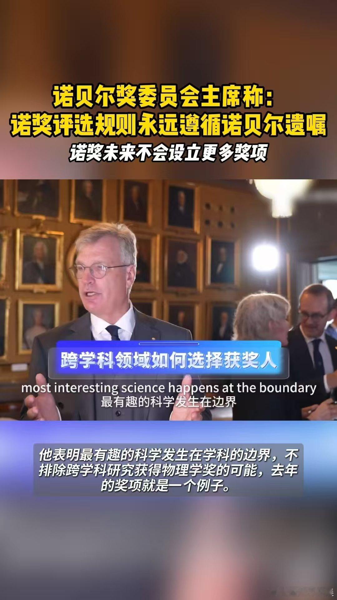 诺奖评选规则永远遵循诺贝尔遗嘱诺奖未来不会设立更多奖项 2025诺奖揭晓后,“为何不设跨学科奖项”成焦点。评委会主席回应:严格按诺贝尔遗嘱评选,不新增奖项。学科边界的科学突破极具价值,完全可纳入物理、化学等现有奖项范畴