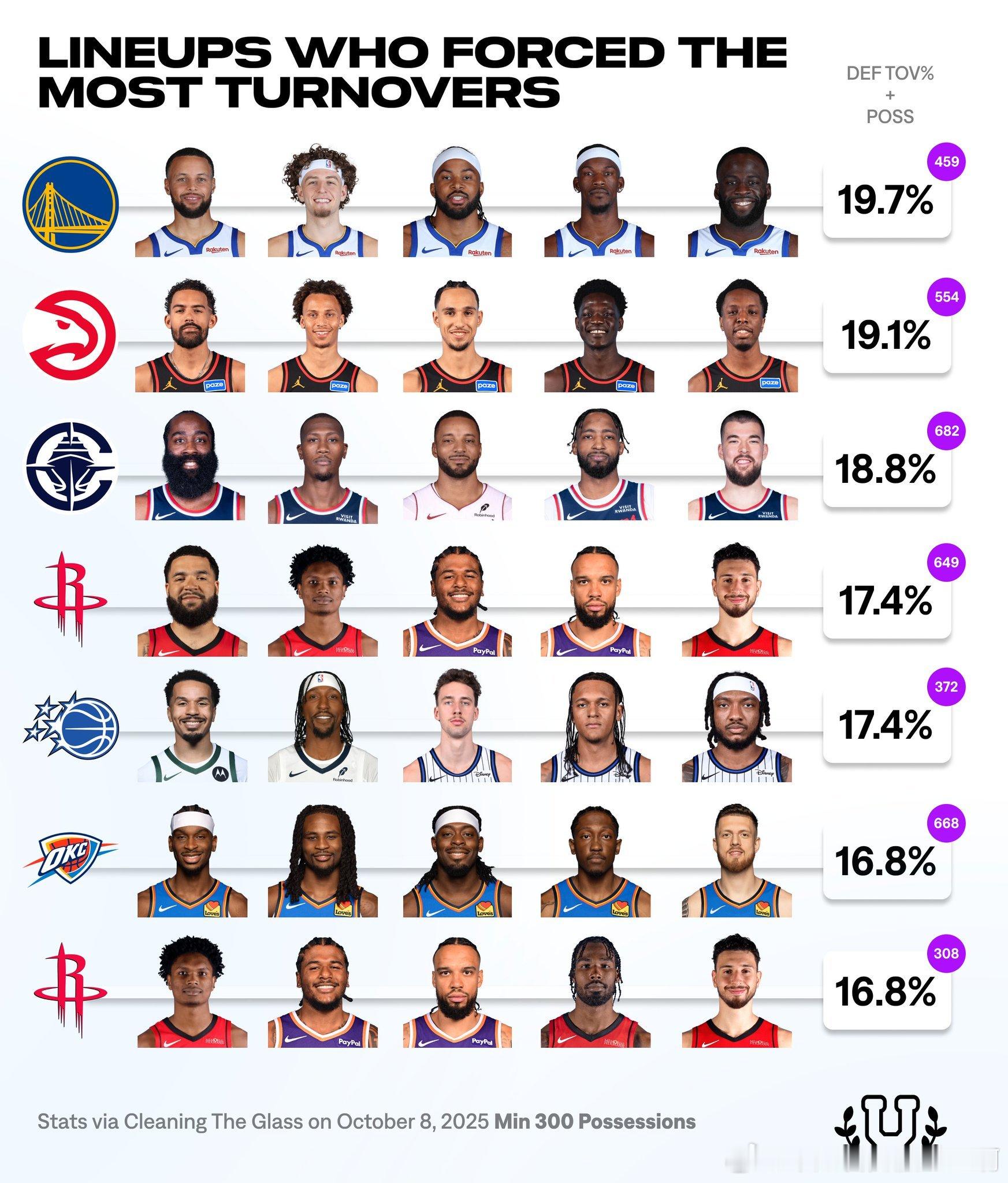 上赛季制造对手失误率最高的阵容一览,火箭队2套阵容入选前七。