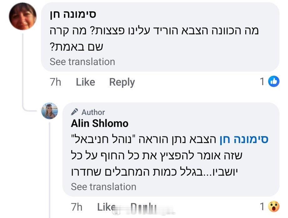 当后来被问及“(以色列)军队向我们投掷炸弹”是什么意思时,阿林于2025年10月7日在 Facebook 上回复(2025 年 10 月 7 日):“由于潜入的恐怖分子数量众多,(以色列)军队下达了‘汉尼拔指令’,轰炸整个海滩,包括海滩上的所有人。”
