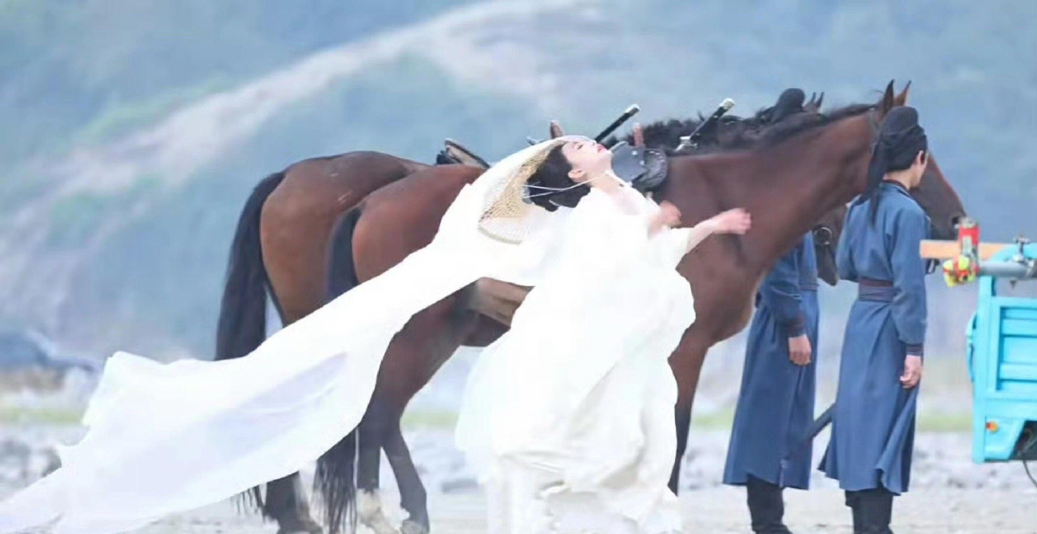 孟子义拍戏摔了孟子义拍戏摔了,奔跑的时候被后面的男演员踩了帽纱,脖子被拽到了,摔