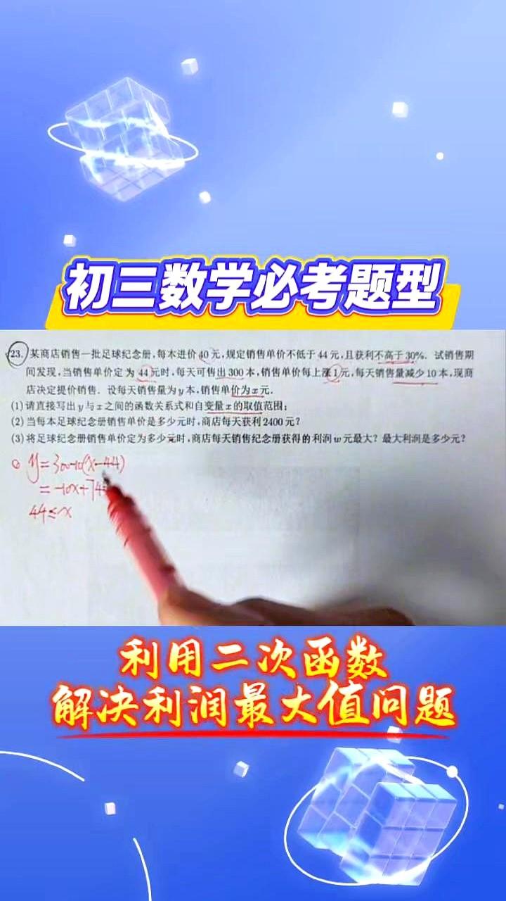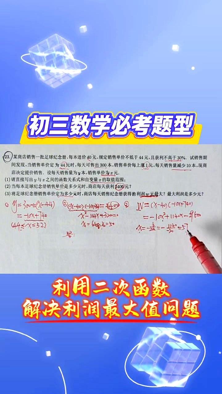 52元定价多赚240元,秘密在初中公式 原价44元只能卖300本,涨到52元反而少卖80本,利润却从2000跳到2640。 孩子把售价x、销量y写成一条直线,再乘每本赚的钱,抛物线最高点被框在52元,57元再好也白搭。 出版社怕压货,硬卡52元封顶,老板要的是仓库空、现金快,不是纸上富贵。 一道题把进货价、库存红线、人心怕贵全算进去,课本瞬间变成收银机。 会算这一步,摆摊、开网店都能用,数学就是帮你把冤枉钱省下来。 留言说说你卖过啥,用这招算过没?