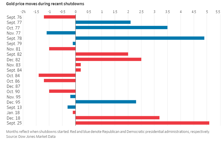 1008市场综述:逢低买入涌现,推动标普500和纳指又创新高,本次政府停摆期间黄金表现远超以往美股美股[超话]