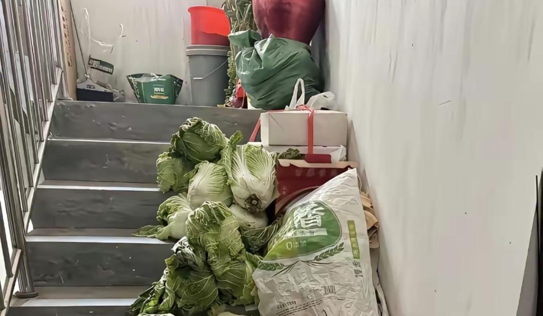保安小李昨天下午查楼,看到三层楼道里突然摆了不少蔬菜,小李就去敲门问业主这是咋回