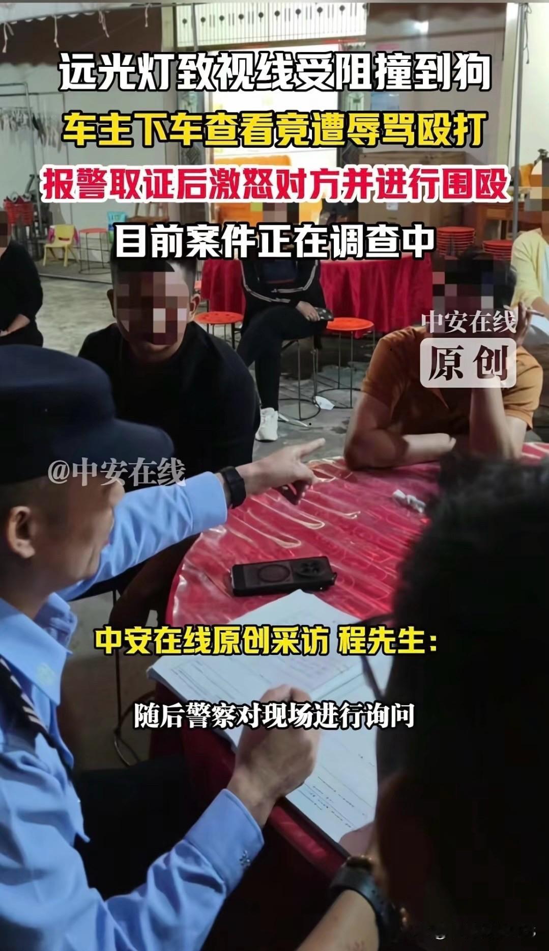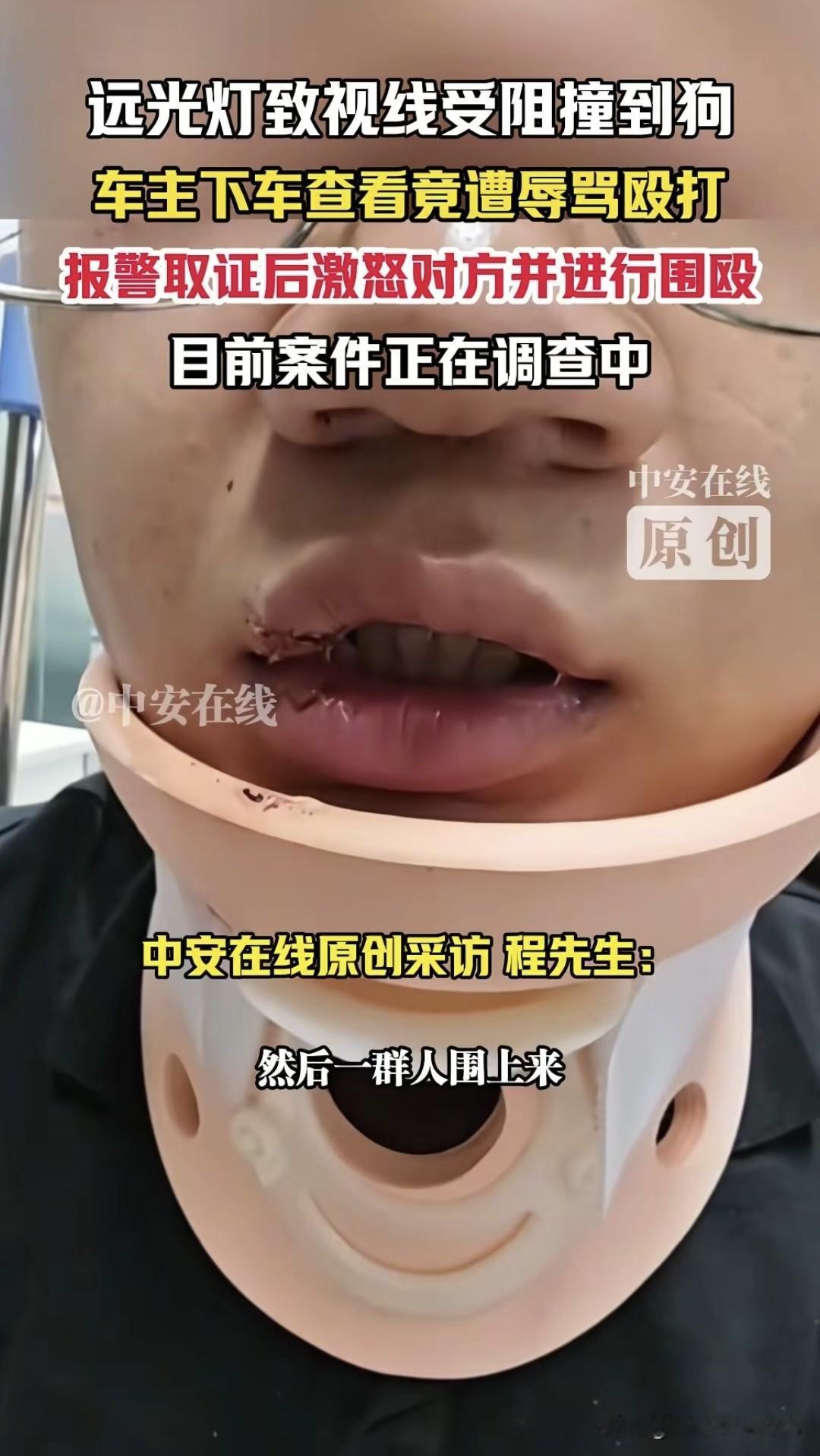 夜间开车遇远光视线受阻撞狗,车主下车遭狗主人带人围殴打进医院。 10月5号晚上,湖北宜昌一条乡间道路上,一位车主夜间开车时,因为对向车辆乱开远光灯,视线被挡,不小心撞到了一只没拴绳的狗。 车主下车查看狗的情况,态度挺平和的,就下意识问了句“你们怎么不把狗看好,太危险了”。结果狗主人和他的十多个同伙一下子围了上来,对着车主恶语辱骂。 其中一个人情绪特别激动,还抬手要打女车主。同行的男性朋友见状赶紧上前劝阻,结果反而被一拳打倒在地,接着就被好几个人拳打脚踢,甚至还有人想拿不锈钢凳子砸人,幸好被旁边的人及时拦住了。 在这过程中,还有一个黑衣女子还强行控制住女车主,趁乱抢走了她的手机,一直不停地辱骂她。直到警察赶到现场,暴力冲突才总算停了下来。 信息来源参考:中安在线