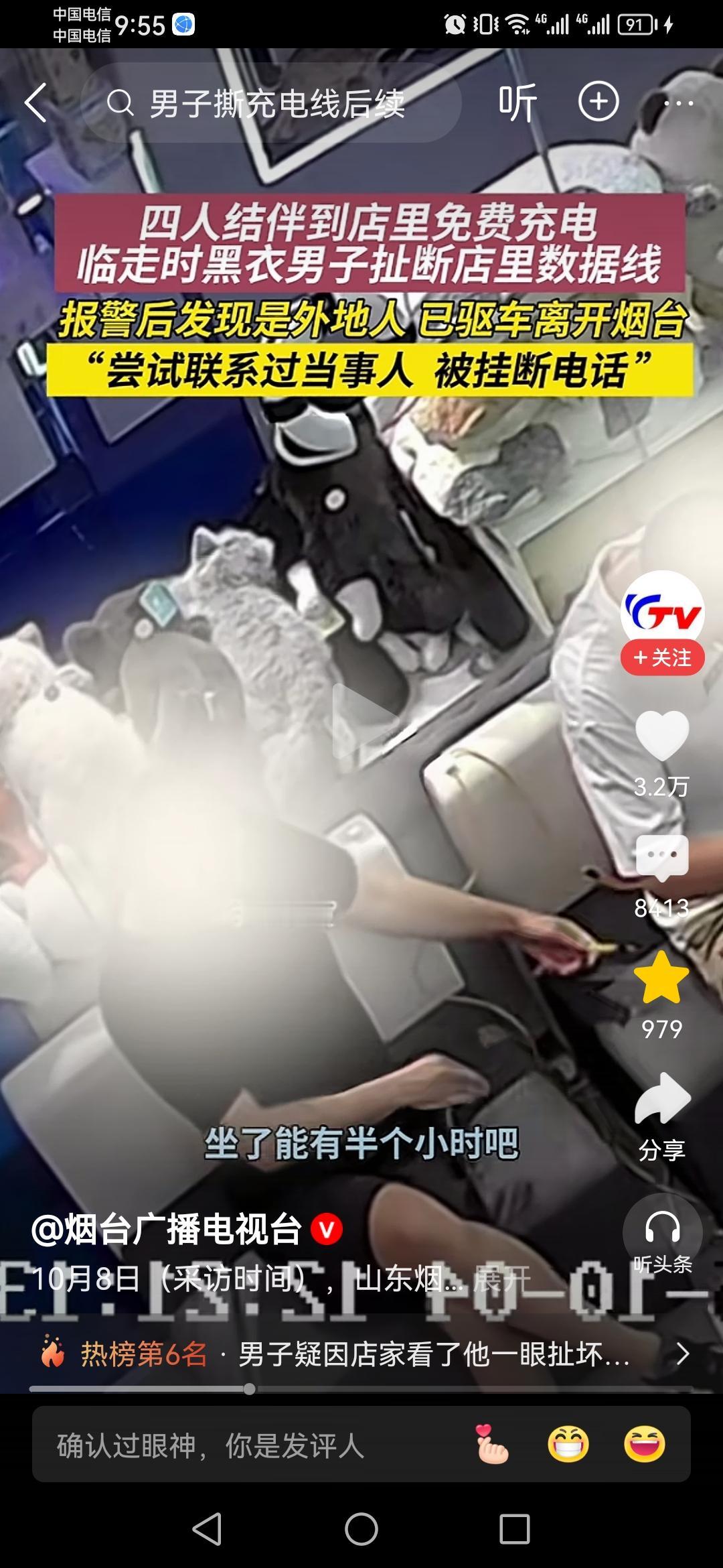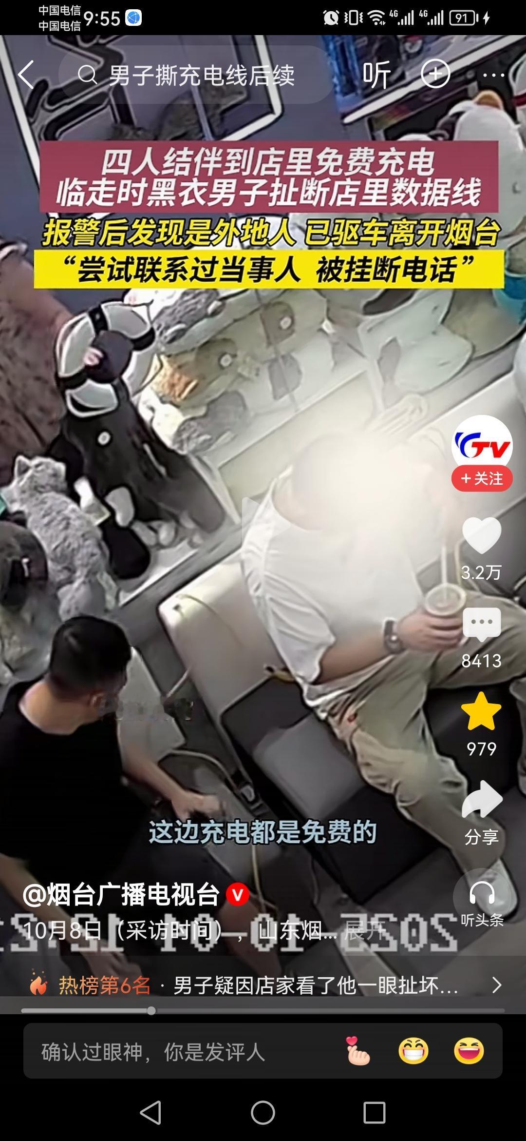 在人家店里免费充电了半个小时, 离开之前还要故意把别人的数据线故意扯断,男子这次恐怕是摊上了大事了! 拒绝电话沟通,警方已经立案! 虽然只是两根不值钱的数据线,但也是体现一个人的基本的素质的问题。 现在好了,因为扯两根数据线,搞到自己上了全网的热搜,最好的办法是,尽快找到店家,主动道歉赔偿啊!