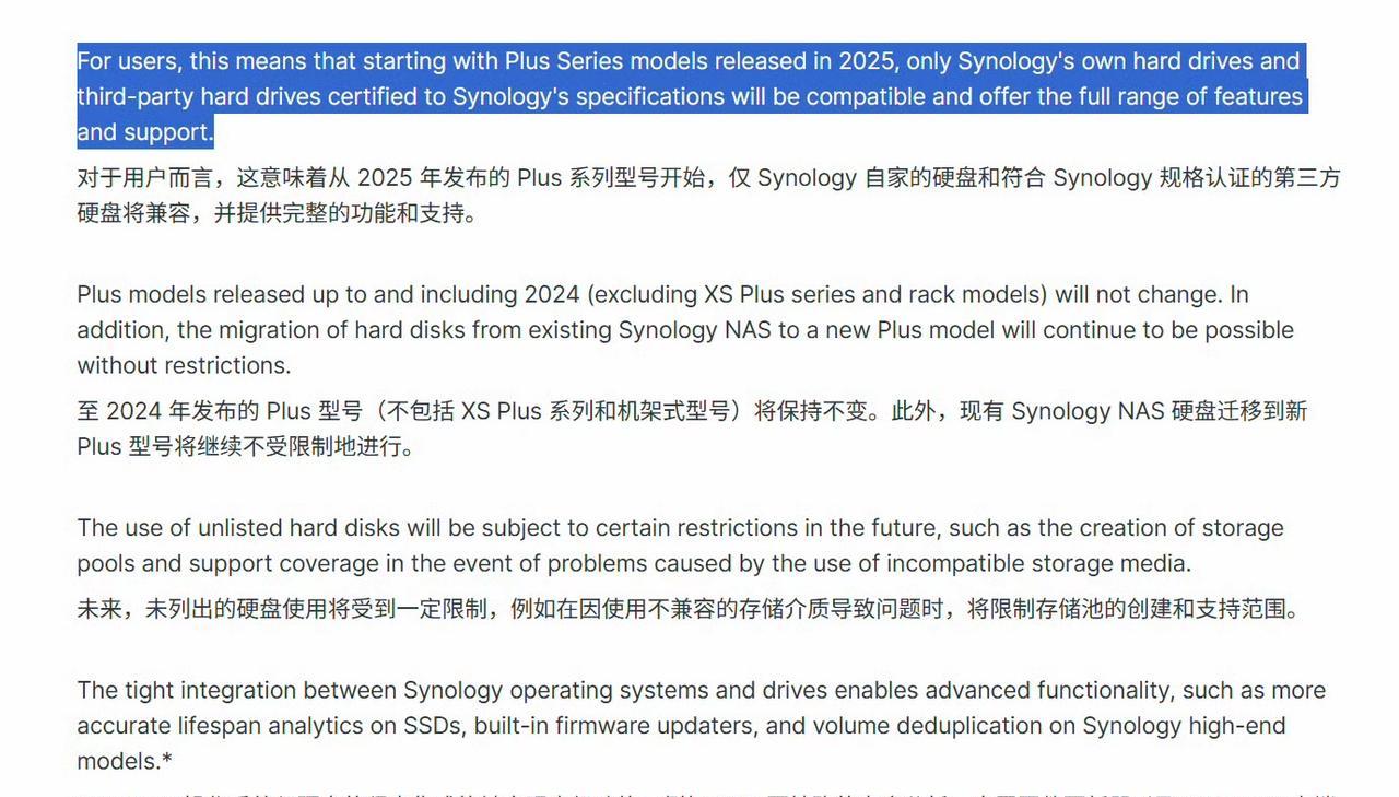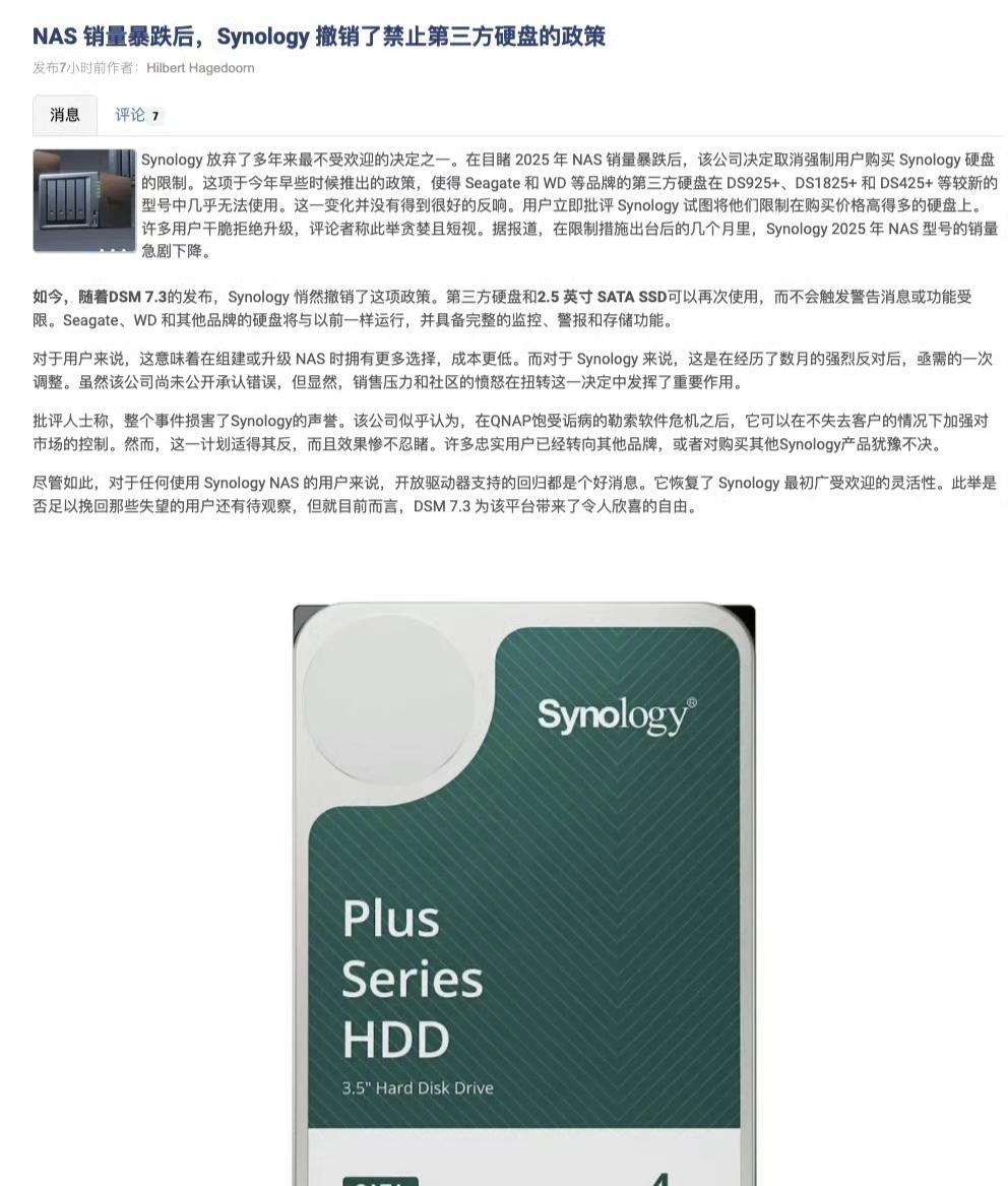 群晖NAS在销量暴跌后终于撤销了先前对于第三方硬盘的严格限制,这波用户政策大转向真可谓是:人教人,教不会;事儿教人,一教就会! 今年4月份群晖NAS发布公告声称:从2025年发布的Plus系列型号开始,仅群晖自有硬盘与符合群晖规格认证的第三方硬盘才能兼容并提供完整功能支持。当时这则公告在消费市场并没有引发太大反应,但却在7月份引发大规模用户讨伐。原因是大家发现群晖NAS之前一直大谈特谈符合认证必须确保兼容性与可靠性,结果到头来符合群晖NAS认证的只有群晖自家硬盘啊,合着其他品牌硬盘卖那么多年都被排除在外了是吧? 这就很搞笑了,难道群晖官方真的认为自己力推的SNV5400系列企业级SSD能入消费者法眼吗?明面上说什么专为群晖NAS研发,但实际上却仅仅支持PCIe 3.0x4,峰值顺序读写速度不过3GB/s,1.6TB售价高达535美元,当时折合人民币大概3830元。我就问这与友商比起来有什么竞争力?竞争力不够,限制政策来凑是吧? 现在好了,群晖NAS限制政策出台之后不仅没有带动自家硬盘销量,反而导致群晖NAS直接销量暴跌。丢掉市场份额之后群晖NAS又开始光速找补,如今又紧急撤销了激起公愤的第三方硬盘限制。大批用户骑脸发问:难道群晖NAS突然直接又不在乎兼容性与可靠性了吗?我们还是喜欢你桀骜不驯的样子! 我奉劝那些想要依靠单一领域优势强行绑定配套产品的各类厂商,甭管你份额有多大,只要你们强推限制给用户制造不便,必会遭到市场反噬!利益相关以为广大用户会屈服限制乖乖选择自家配套商品,这种想法大错特错,绝大多数人会干脆放弃继续使用贵司产品!